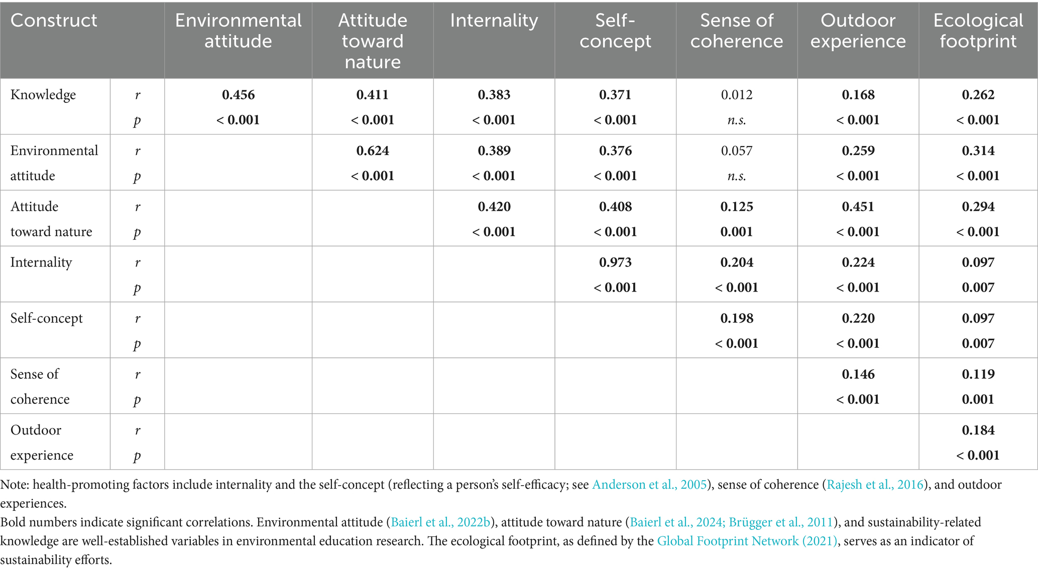 We first conducted Pearson correlations to examine the relationship between health-promoting factors, attitudes, knowledge, and the ecological footprint as a behavior indicator (see Table 2). Our findings are consistent with existing literature. For instance, environmental attitudes show a stronger correlation to pro-environmental behavior than knowledge levels do (e.g., Pooley and O’Connor, 2000). Then, we find the typical correlation between attitude toward nature and environmental attitude (e.g., Baldi et al., 2021; DeVille et al., 2021; Mackay and Schmitt, 2019), while the correlation between environmental attitude and knowledge levels is stronger than the correlation between attitude toward nature and knowledge (e.g., Baierl et al., 2024). We also find a significant positive correlation between internality and self-concept, indicating that both contribute to a person’s self-efficacy within their locus of control (Anderson et al., 2005).