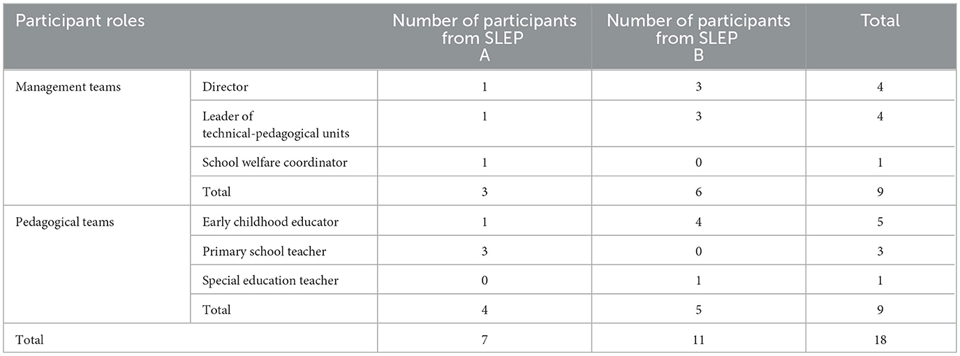 Three SLEPs from different regions in the country were contacted and invited to participate in this research. Two of them agreed, SLEP A is in northern Chile, whereas SLEP B is in central-south Chile. They are part of the second and third cohorts of SLEPs, having been fully operational since 2021. They oversaw approximately 80 educational institutions and between 10,000 and 20,000 students each. According to data provided by the National Institute of Statistics for 2025 [Instituto Nacional de Estadísticas (INE), 2019], both serve a territory composed of a larger municipality with a rural population of approximately 10% and some smaller municipalities with rural populations ranging from 20% to 100%. In total, school workers from five schools agreed to participate, conforming two cohorts:
