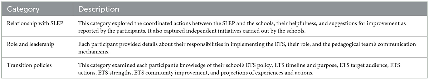 Quantitative data analysis focused on the survey's closed questions. We asked school workers: (a) whether their institution had a written policy regarding the educational transition from kindergarten to first grade, (b) whether their institution's educational improvement plan included actions to support this transition, and (c) whether their SLEP's support helped implement actions to support this transition. These three questions had binary yes/no answers, and we calculated the percentage of participants who responded positively to each of them. In addition, we presented school workers with a list of 15 transition actions, many of which were described in the literature (Dockett and Perry, 2007; Peters, 2010). We asked them to indicate whether they had taken part in each of these actions and, if so, how helpful they considered each action to be. Regarding participation, we reported the percentage of participants who declared having taken part in each transition action. Regarding helpfulness, we noted that no participant declared any action as “not helpful.” Therefore, we reported the percentage of participants who declared each action to be “Very helpful” (vs “Somewhat helpful”), considering only those who had stated that they had taken part in each corresponding action. Whenever relevant, we examined the responses of each SLEP and/or compared those of management and pedagogical teams separately.