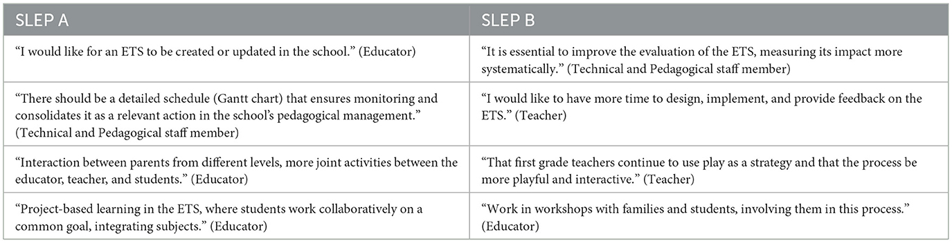 To conclude, all schools agreed on the need to allocate more resources and time for the design and implementation of an ETS, as well as the importance of involving families in joint activities and the pedagogical processes that shape children's educational trajectories. Additionally, the use of play as a strategy for interactive educational transitions is valued, and the systematic evaluation of an ETS is considered a shared priority. Regarding future plans, schools in SLEP B emphasised the programming of cultural activities and workshops for parents. In contrast, schools in SLEP A emphasised the implementation of project-based learning as a tool to connect subjects and promote collaboration. Some reflective quotes regarding this discussion are shown in Table 3.