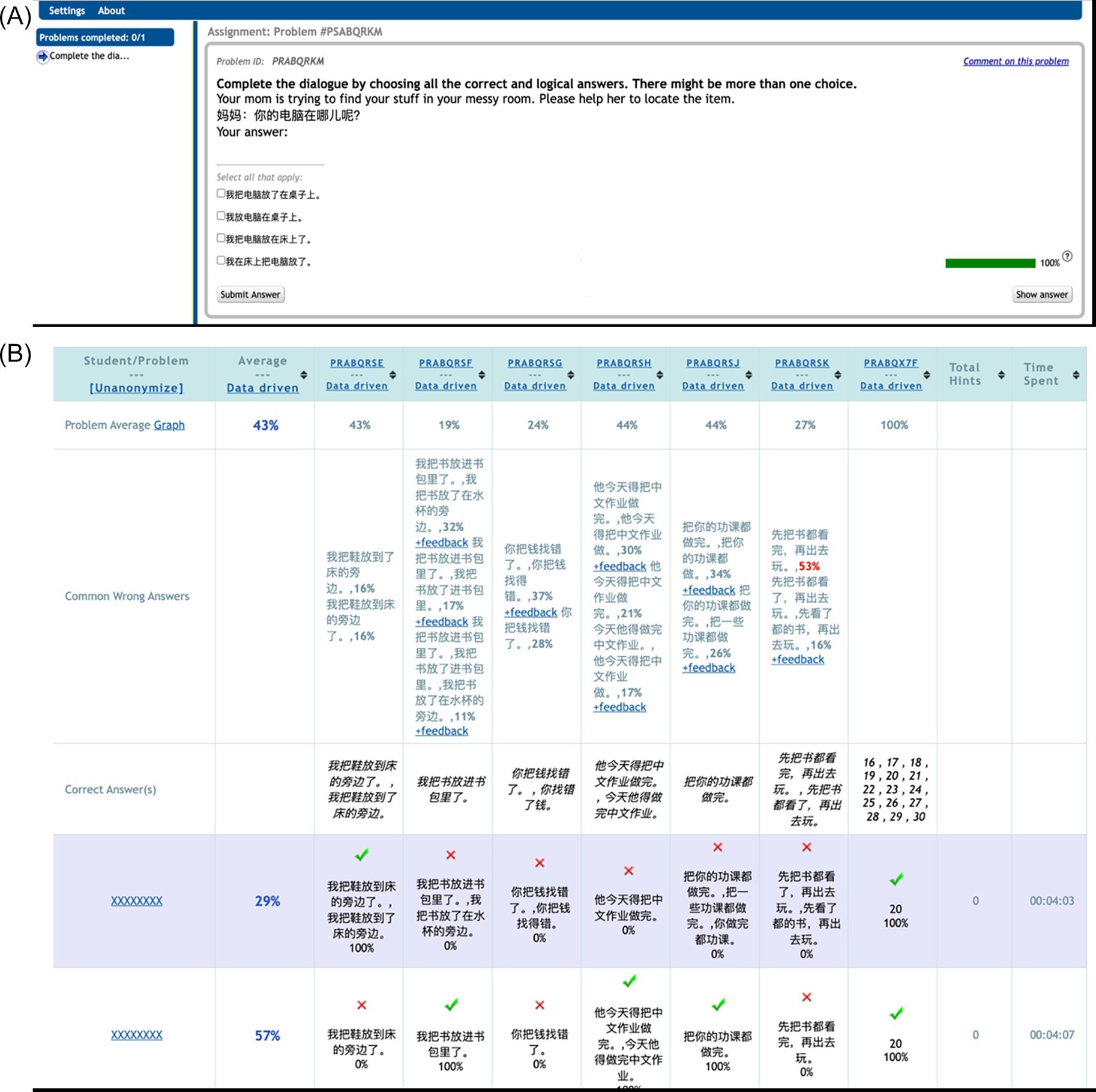 The experiment was conducted in-person using the ASSISTments platform, which is an online learning platform designed to provide support to students through hints, feedback, and scaffolding (Heffernan and Heffernan, 2014). All assignments, pretests, and posttests were administered during class time. Figure 2 displays the interfaces of ASSISTments as seen by students, instructors, and researchers. The pretest, quiz assignments, immediate feedback, and posttest were all delivered through the ASSISTments platform. Prior to analysis, the research data was anonymized by the platform to ensure confidentiality. For each course, daily in-class quizzes were administered to all students using their personal laptop computers. As a result, all students were already accustomed to taking online quizzes and were provided with laptops at the start of the semester to ensure inclusivity.