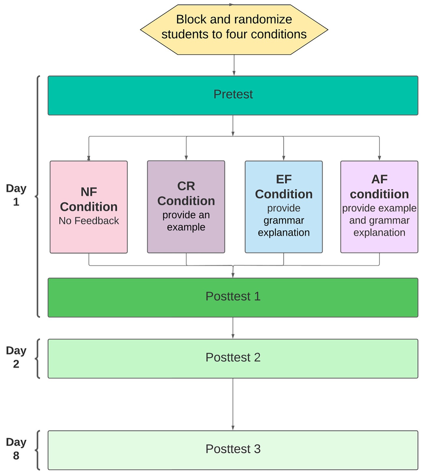 To ensure that the study met ethical requirements, all students in the four conditions received all types of feedback by the end of the experiment to guarantee equal learning opportunities. Instructors also went over the target grammar usage in the classroom after the experiment to eliminate any remaining confusion. All the experiments took place in the classrooms to guarantee that students did not receive extra support beyond the feedback. The experimental procedure is displayed in Figure 3.