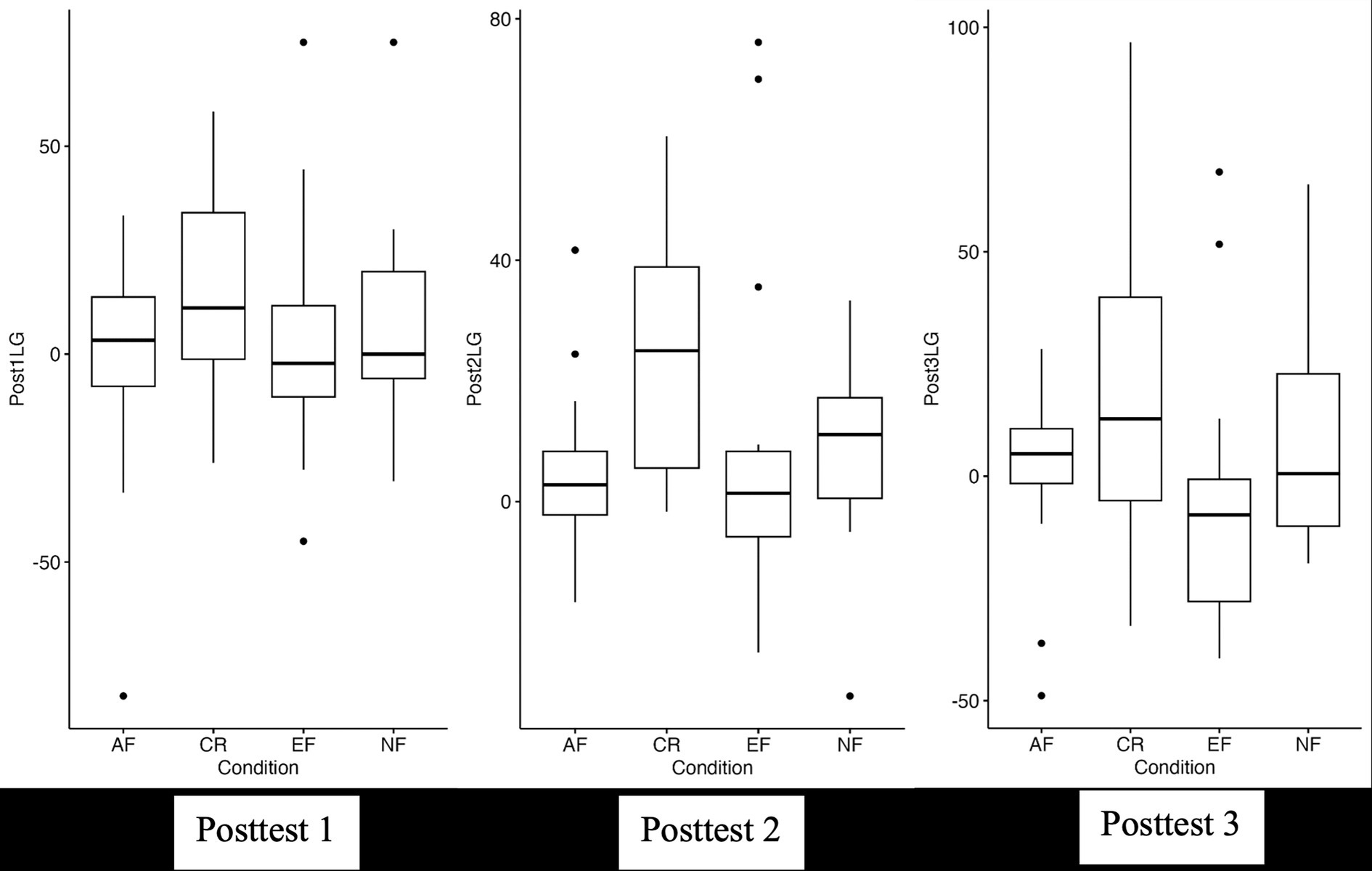 In summary, robust ANOVA findings did not indicate that providing feedback to SOE questions resulted in better performance compared to the absence of feedback, contradicting Hypothesis 3 (H3). However, providing CR was more effective than providing EF in the Posttest 2 results. This finding differ from our Hypothesis 4 (H4), which proposed that providing AF would be the most effective in enhancing learning. They also contradict Hypothesis 5 (H5), which suggested that students receiving more complex feedback with EF will achieve greater learning gains than those receiving only CR. Figure 4 displays the boxplot of the three posttest learning gains for different conditions, which supported the observed differences between the conditions.