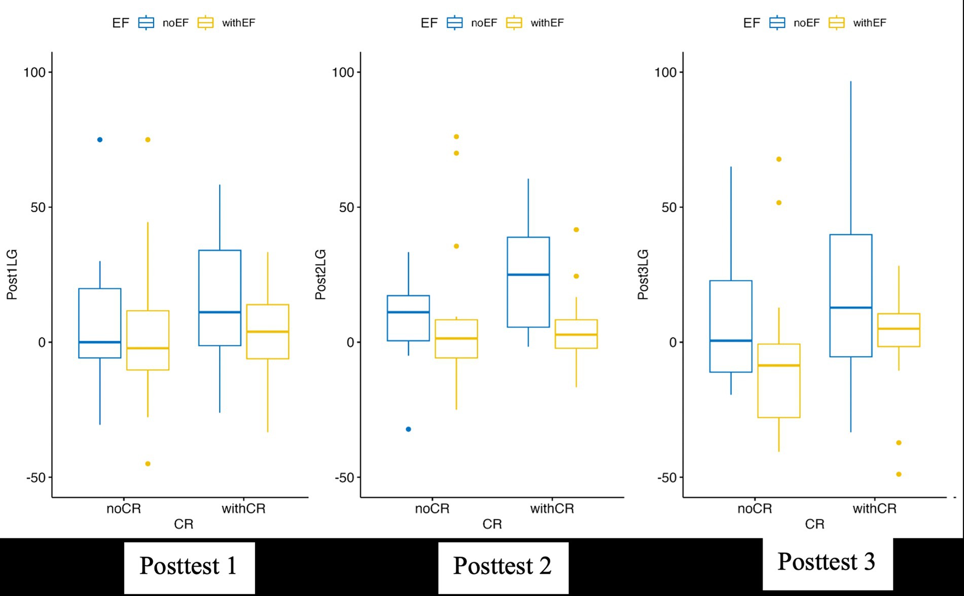 The results revealed that providing EF or not played a significant role in the posttest learning gains. Regardless of whether CR was provided or not, the provision of EF negatively affected learning. The difference was not significant in Posttest 1, but it emerged in both Posttest 2 and Posttest 3. To better illustrate how providing EF affects learning gains under different conditions, a boxplot for the three posttest learning gains with the two factors is presented in Figure 5. As shown in the boxplots, across all three posttests, conditions without EF (marked in blue) consistently outperformed those with EF (marked in yellow), regardless of whether CR was provided. This finding contradicts our Hypothesis 5 (H5) and suggests that students’ performance in response to different types of feedback does not align with instructors’ perspectives on feedback effectiveness. While the earlier survey indicated that instructors believed high-complexity feedback, such as AF, would lead to greater learning gains, our experimental results revealed that more complex feedback actually had a negative impact on learning.