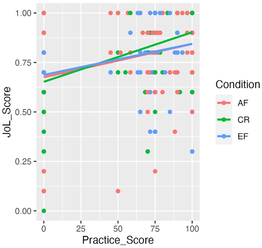 An alternative explanation for the observed results draws on the idea that learners tend to base their judgments of learning on the fluency or ease of processing of the information presented (Castel et al., 2007; Yue et al., 2013). In this context, it is likely that participants perceived the concise, one-sentence correct examples provided in the CR condition as more fluent and easier to process than the more detailed grammar explanations found in the EF and AF conditions, even though the latter contained a greater amount of instructional information.