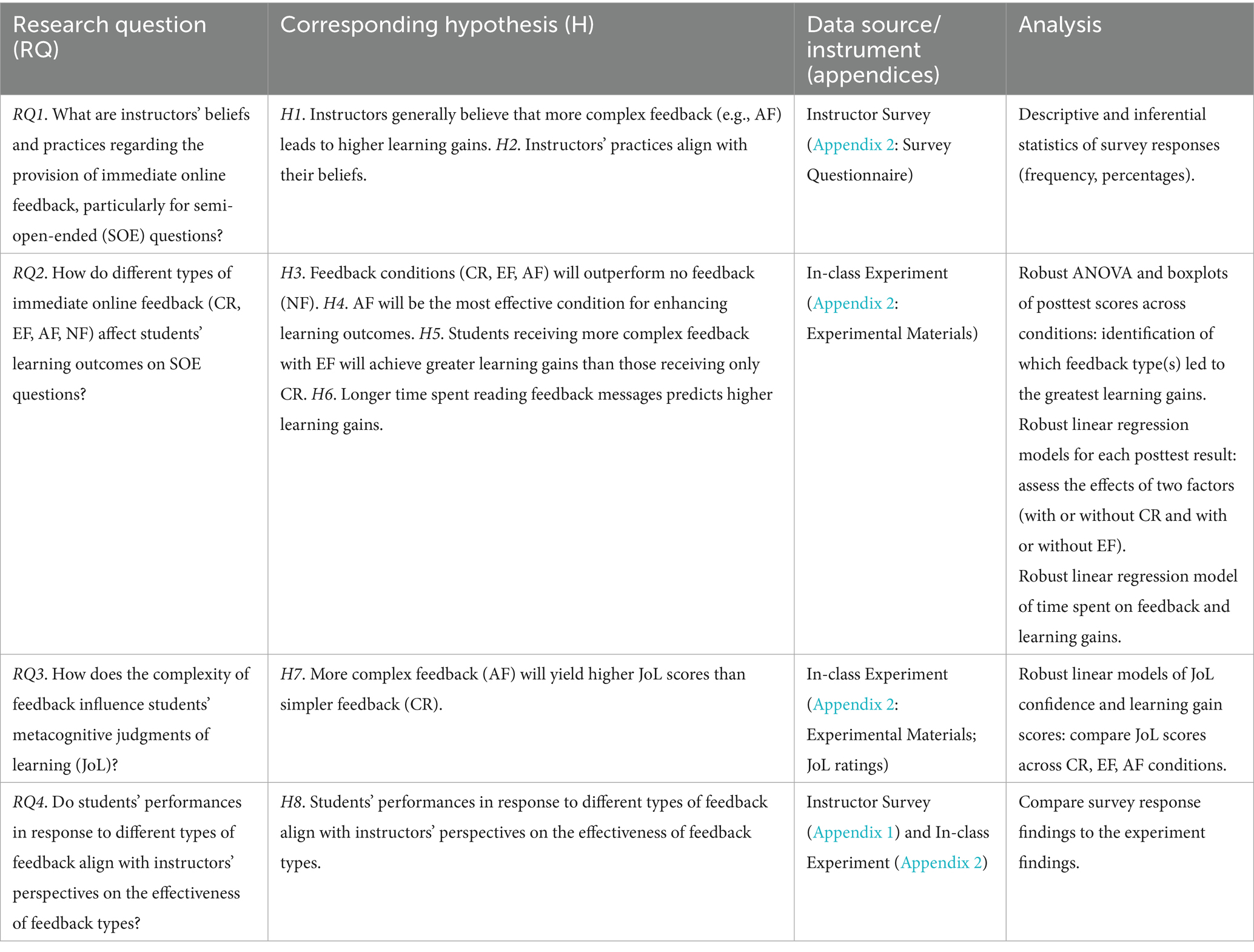 Given the previous literature results, we hypothesized that instructors believe that high complexity feedback (AF) to SOE questions would lead to greater learning gains (H1), and that their instructional practices would align with these beliefs (H2). CR, EF, and AF would outperform NF (H3), and AF would potentially be the most effective in enhancing learning (H4). Students receiving more complex feedback with EF will achieve greater learning gains than those receiving only CR (H5). For the relationship between time spent on feedback and learning, we anticipated that the duration of time spent on feedback messages would positively predict learning gains (H6). We also hypothesized that feedback with high complexity (AF) would yield greater JoL scores compared to CR and EF (H7). Finally, students’ performances in response to different types of feedback align with instructors’ perspectives on the effectiveness of feedback types (H8).