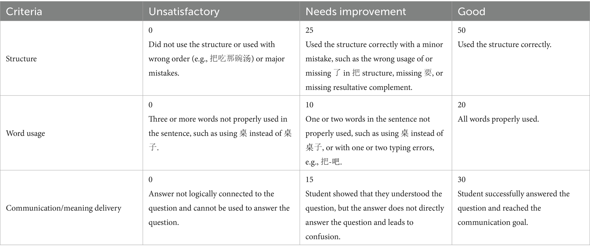 All questions, including the pretest, practice questions, and the three posttests, underwent anonymization and were manually assessed by three raters using a grading rubric. The grading rubric utilized in the study is provided in Table 2. Each question was assigned a maximum of 100 points and evaluated based on three criteria: structure (50 points), word usage (20 points), and communication (30 points). In cases where typing errors occurred (e.g., “我闷” instead of “我们”), these errors were considered as incorrect word usage. If an answer did not employ the designated structure at all, it received a score of 0. Likewise, if the answer utilized the structure correctly but lacked logical coherence with the question, indicating a lack of understanding of the question or grammar usage and a failure in communication, the answer also received a score of 0.