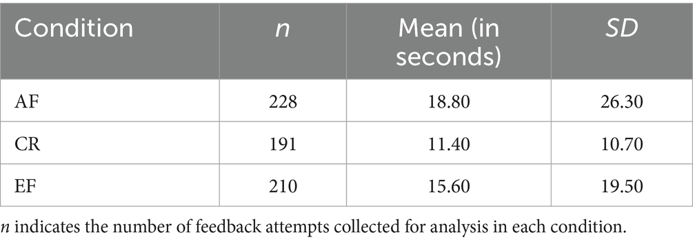 To further investigate why EF was less effective than instructors had expected, and to understand how students interacted with feedback under different conditions, we analyzed data collected during the experiment. We first examined the time spent on problems as a potential factor. The time spent on each problem was determined by subtracting the problem start time from the problem end time. We constructed a robust linear model, clustering the data by student ID and employing the CR2 standard error type, to assess the relationship between the time spent on each problem and the condition. Twenty-three problems that took longer than 5 min were deemed errors and subsequently excluded from the data. The model did not yield significant results (F[3, 95] = 1.32, p = 0.27), indicating no significant differences in time spent on problems were observed between the conditions.