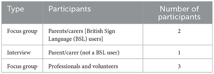 The two focus groups and the interview were conducted in June/July 2022. One focus group was conducted remotely using Microsoft Teams with two parents/carers who were British Sign Language (BSL) users (see Table 1). The researcher was the main facilitator although two other adults were present, including a BSL interpreter. Both parents/carers were female. One parent had two male children, one of whom was deaf. That child was of pre-school age and attended a childminder. He had been taught to use sign language but could also use oral language. The other parent had three children (two girls and one boy) who were all deaf. They were aged 16, 10 and 3 years. The eldest child was at secondary school; the middle child was at a mainstream primary school and the youngest child was at nursery. All three children were able to use sign language. One of the parents was in the same room as the BSL interpreter and the other adult. The other parent joined remotely from abroad as she was on holiday. Children were present during the session, but they did not contribute to the conversation. The focus group was 43 min duration.