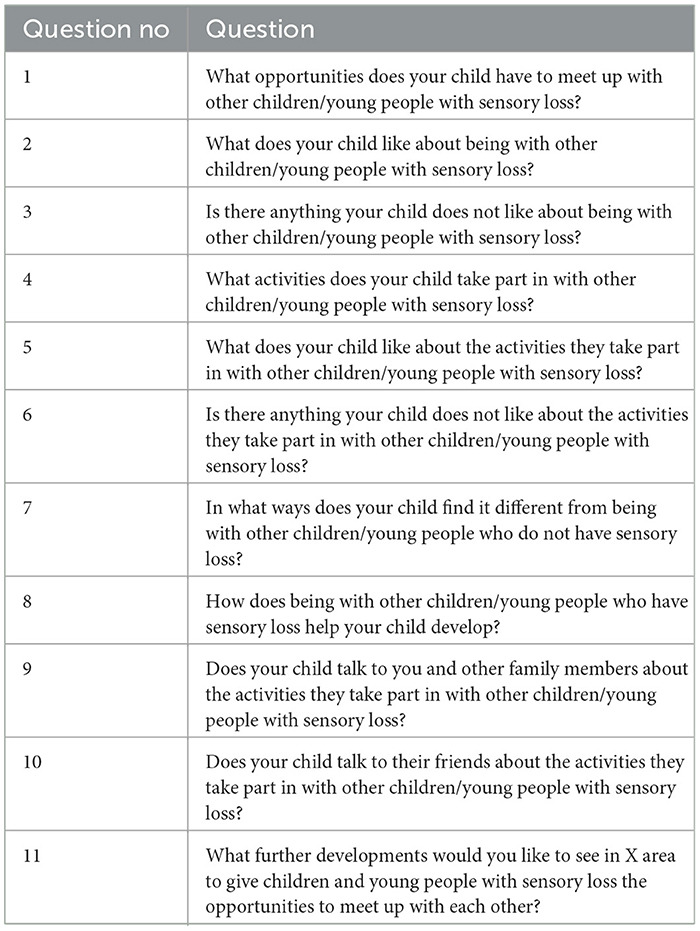 The focus group and interview questions were linked to the objectives of the study (see Tables 2, 3). As such, they were designed to explore the participants' views of different aspects of CYP's experiences of being with other CYP with sensory loss. The questions were shared in advance with members of the Reference group so feedback was provided prior to implementation.