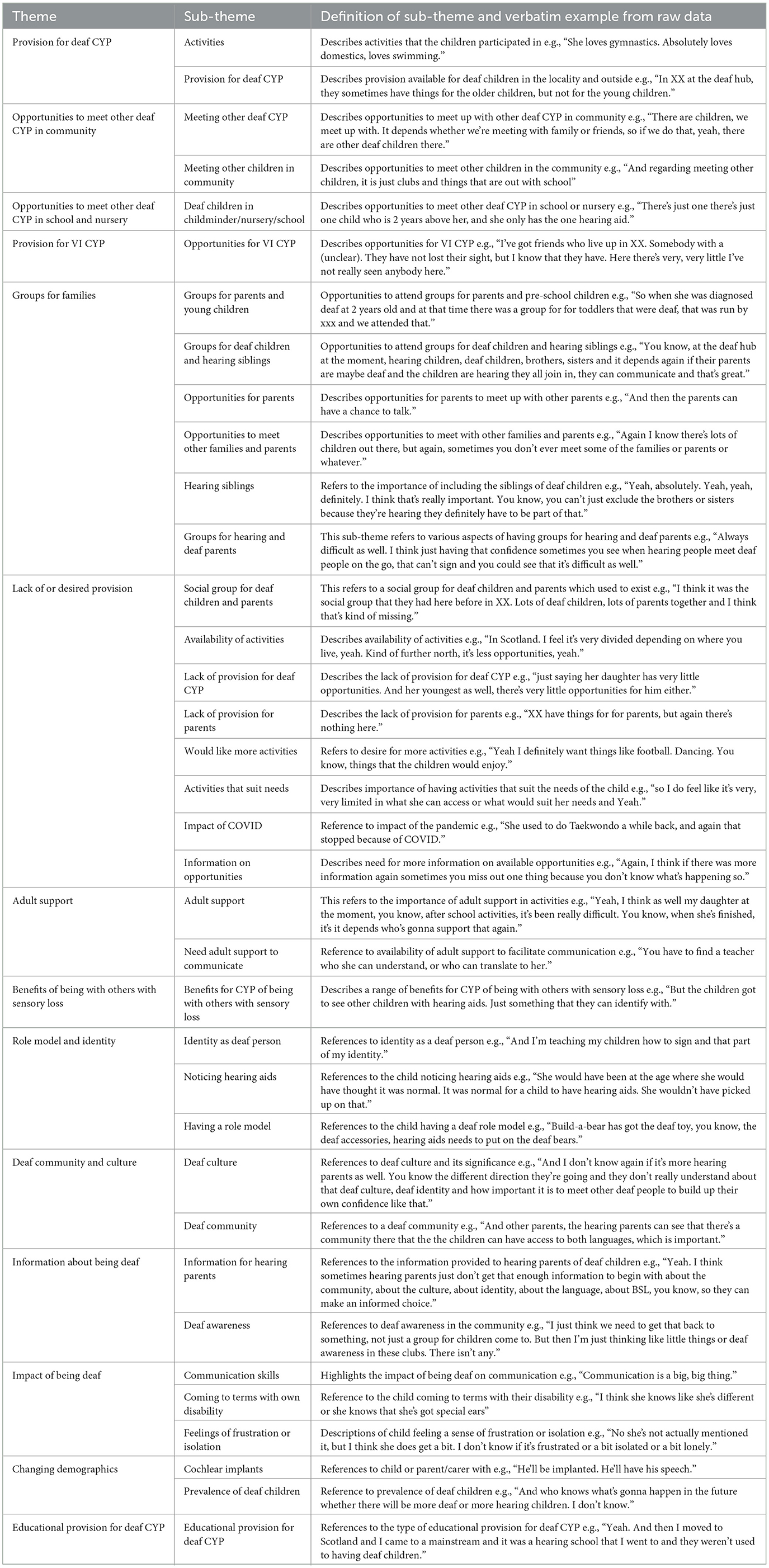 The theme “Provision for deaf CYP” comprised two sub-themes “Activities” and “Provision for deaf CYP.” The parent in the semi-structured interview mentioned activities that her daughter enjoys, namely gymnastics and swimming. In the focus group with two parents, there was reference to provision for deaf children and young people in other areas of Scotland. In XX area, it was noted that the Deaf Hub has activities for older children but not young children.