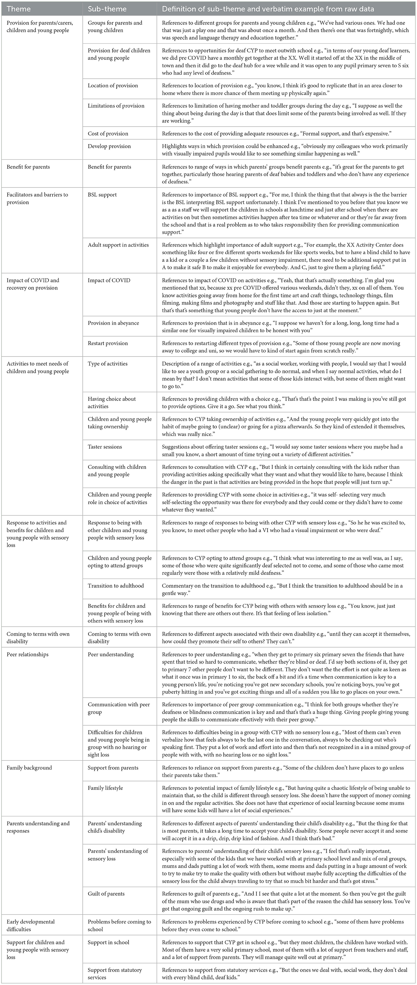 The theme “Provision for parents/carers, children and young people” encapsulated the sub-theme “cost of provision” highlighting the costs associated with providing support for children and young people with sensory loss to participate in activities. The support referred to various aspects associated with the organization of activities/events, undertaking risk assessments, and provision of resources (people and equipment). On a positive note, one of the participants offered a recent example of an organization who had provided their services for free. The “location of provision” was another sub-theme. Some organizations, such as the National Deaf Children's Society, offered activities but these did not necessarily take place in X locality. Participants commented on positive aspects of these activities e.g., children and young people can link up with others. However, they also noted that it may be difficult to maintain relationships even with the support of technology. So, on balance, it was felt that it would be important to have activities nearer to the home locality.