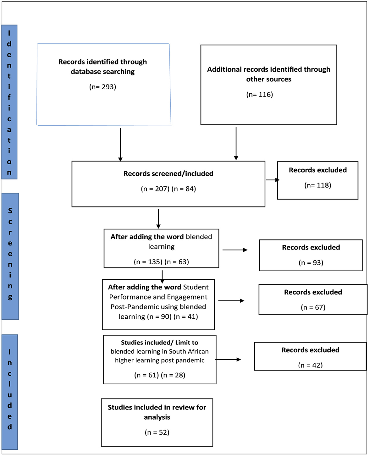 In this study, the PRISMA flow diagram was utilized to methodically record the literature selection procedure to examine the effects of blended learning on South African higher education following the pandemic.