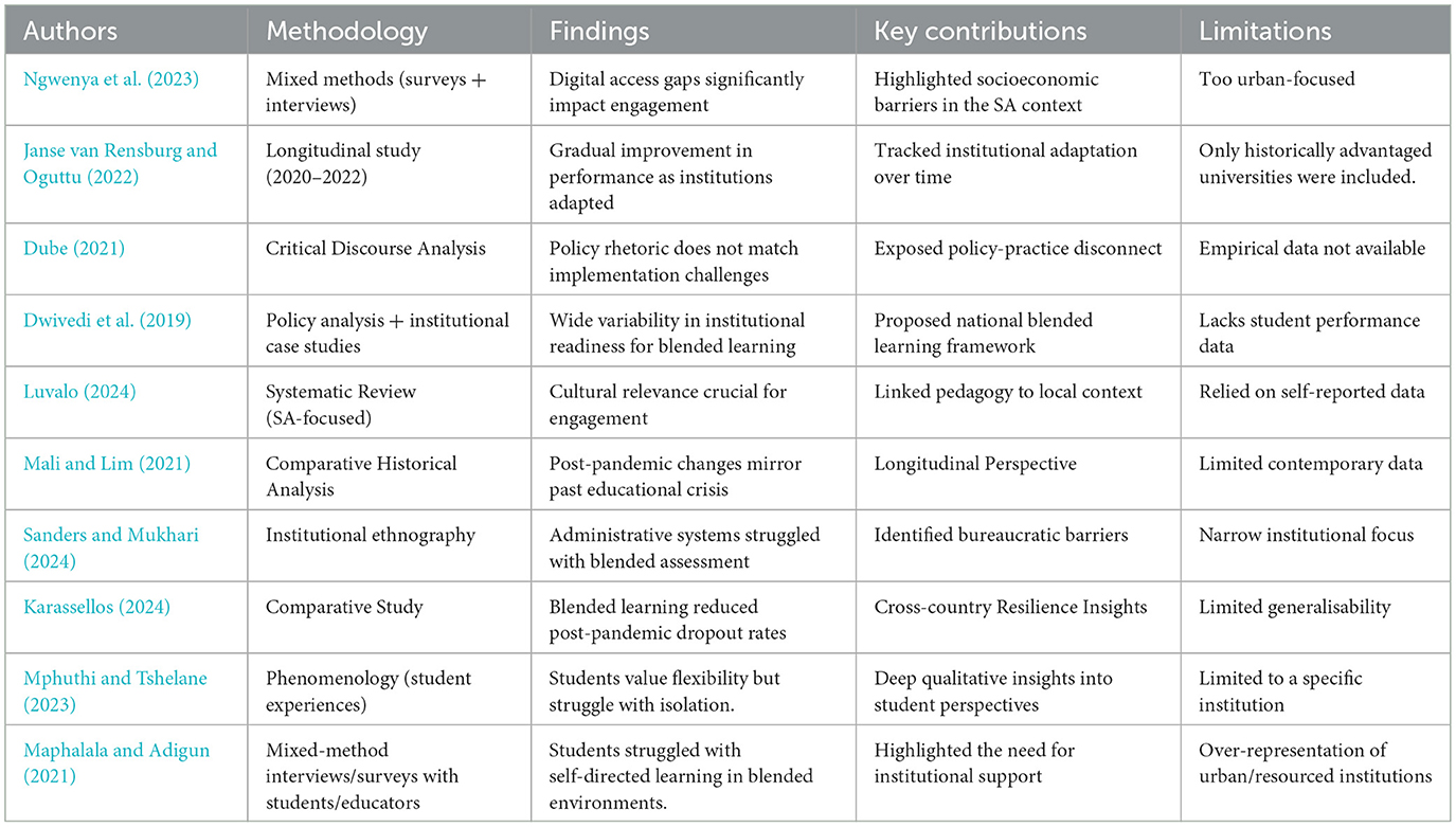 In addition to highlighting important research needs, Sanders and Mukhari (2024) assert that the rapid adoption of blended learning in South African higher education has also revealed new best practices. Therefore, understanding the long-term effects of blended learning on student performance across various socioeconomic groups is an important knowledge gap. Although early research shows that some students have more freedom and access, less is known about the effects of long-term hybrid learning on graduation rates, employability, and cognitive development, especially for students from underprivileged backgrounds (Janse van Rensburg and Oguttu, 2022). Furthermore, as present blended models frequently duplicate western frameworks without sufficient adaptation to South Africa's multilingual and multicultural context, additional study is required on culturally responsive teaching approaches in digital spaces. Therefore, the psychological impacts of less in-person participation are also poorly understood, particularly for first-year students who may experience feelings of loneliness and a lack of campus integration (Jowsey et al., 2020).