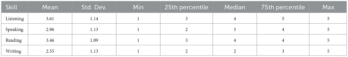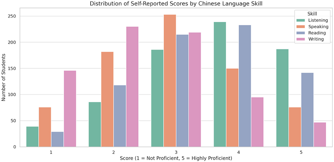 Figure 4 and Table 2 jointly present the descriptive and distributional characteristics of students' self-reported proficiency in four Chinese language skills: listening, speaking, reading, and writing.