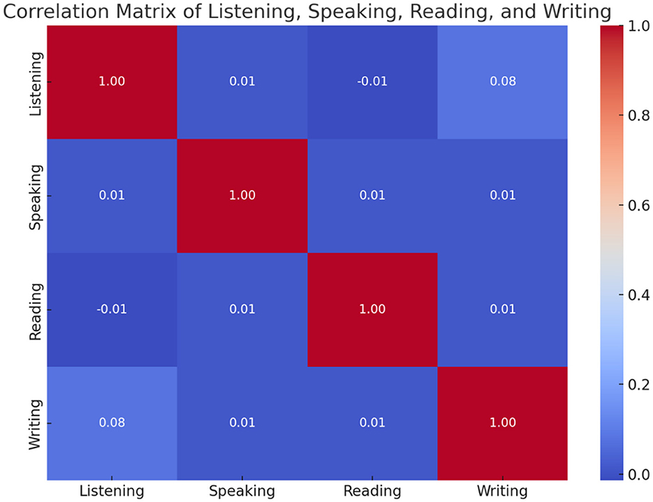 Specifically, the correlation between listening and writing is the highest observed (r = 0.08), though still very small in magnitude, suggesting a slight positive relationship. The correlations between all other pairs of skills (e.g., listening–speaking, speaking–reading, reading–writing) hover around 0.01 or even −0.01 (e.g., listening–reading), implying almost no observable co-variation in learners' perceived proficiencies across these domains.