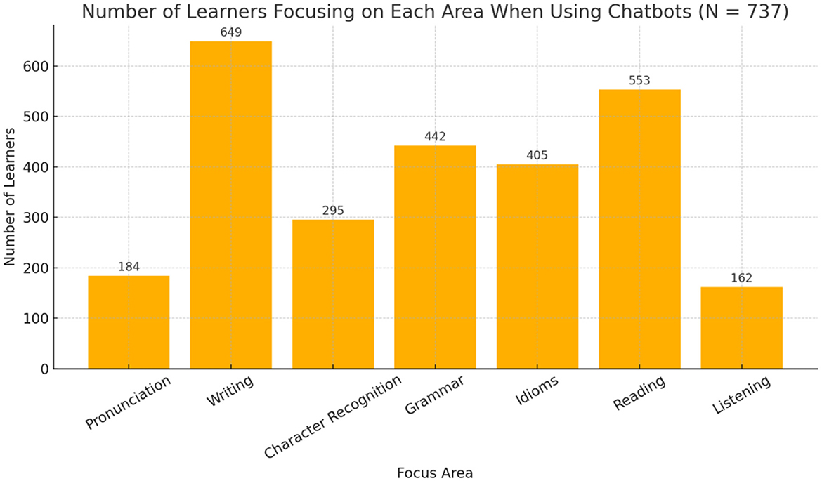 Writing emerges as the most emphasized area, with 649 learners (approximately 88%) indicating it as a key focus. This suggests that learners heavily rely on chatbots to enhance their written Chinese, likely due to the availability of grammar correction, composition assistance, and sentence structuring features. Reading follows as the second most common focus, with 553 learners (75%), reflecting the chatbots' utility in supporting reading comprehension, vocabulary acquisition, and content interaction. Other areas such as grammar (442 learners) and idioms (405 learners) also attract significant attention, indicating learners' interest in improving structural understanding and cultural nuance in language use. Character recognition (295 learners) is moderately emphasized, likely due to the visual input features available in chatbot platforms.