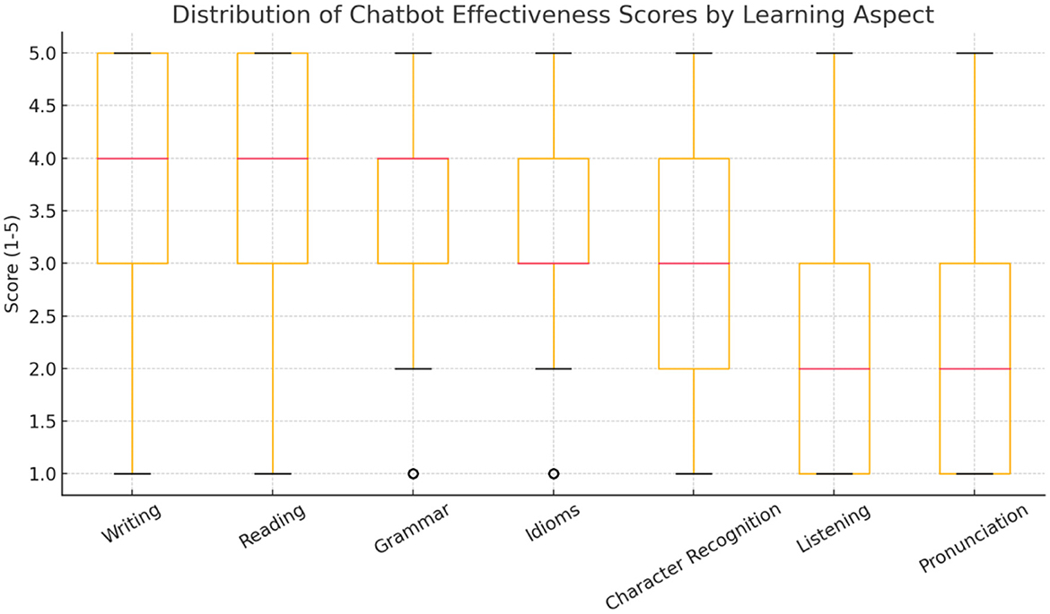 Writing and reading exhibit the highest perceived effectiveness, suggests a strong consensus among learners regarding the chatbots' utility in supporting literacy-oriented tasks such as text generation, comprehension, and sentence construction. These areas also display minimal presence of low outliers, indicating consistently positive evaluations. Grammar, idioms, and character recognition receive moderately high ratings, with medians around 3–4. While generally perceived as effective, the wider interquartile ranges and occasional low outliers (notably in grammar and idioms) imply more variability in user experiences. This could reflect differences in chatbot design, user proficiency levels, or the complexity of conveying nuanced linguistic features through AI. In contrast, listening and pronunciation are rated lowest in effectiveness, both with medians at 2 and interquartile ranges concentrated between 1 and 3. This outcome reflects a widespread perception that current chatbot platforms are less equipped to facilitate oral-aural skills, likely due to limitations in speech recognition, feedback latency, and lack of natural spoken interaction.