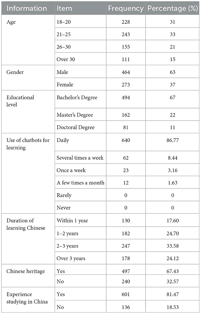 This study utilized an online questionnaire distributed primarily through social media platforms such as Facebook, Instagram, WeChat, and WhatsApp. Additionally, support was sought from Chinese language instructors working at Confucius Institutes to assist in the dissemination of the survey. Seven hundred thirty-seven participants were recruited using a convenience sampling method. These respondents were affiliated with Confucius Institutes located in Southeast Asian countries, including Thailand, Indonesia, the Philippines, Malaysia, Singapore, Cambodia, Laos, and Vietnam. All participants had prior experience using AI chatbots for learning Chinese. Eligibility focused on learners studying Chinese as L2/CFL at CIs; heritage background was recorded as a control variable and does not indicate native-speaker status.