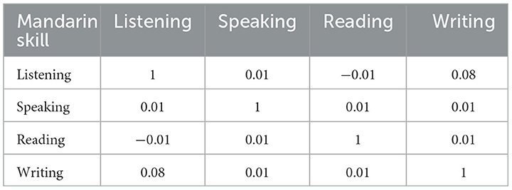Figure 5 and Table 3 together present the correlation matrix among the four self-reported Chinese language skills—listening, speaking, reading, and writing. The results reveal that the correlations among these language skills are generally very weak and close to zero, indicating minimal linear association between them in this sample.