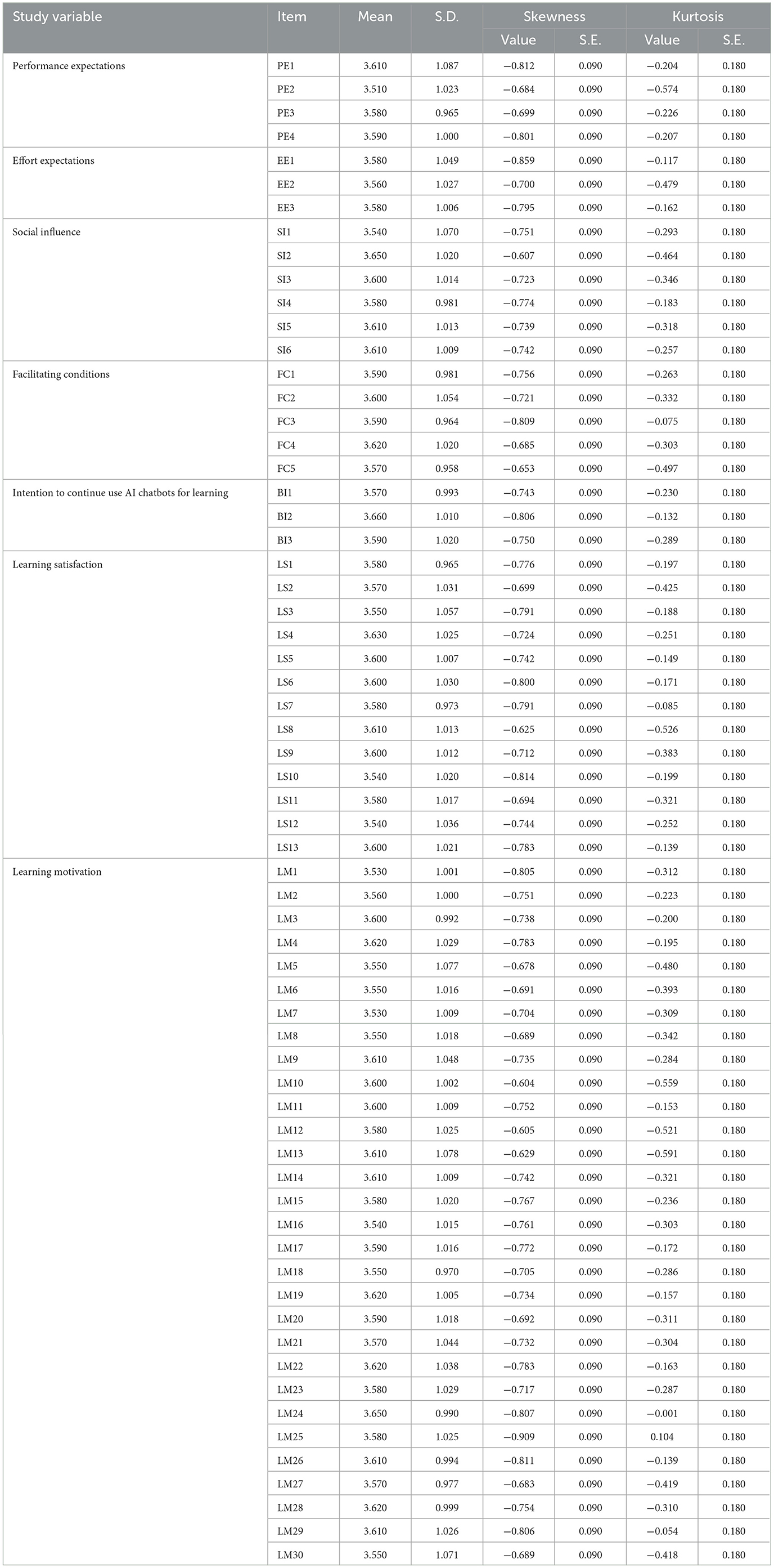 The standard deviations (S.D.) fall mostly around 1.00, revealing moderate variability in learners' responses. This dispersion suggests that while overall perceptions are positive, individual experiences differ depending on context, user familiarity, or institutional support. The skewness values are consistently negative across all items, generally ranging from −0.60 to −0.90, indicating a left-skewed distribution. This suggests that more respondents provided ratings at the higher end of the Likert scale, reinforcing the conclusion that attitudes toward chatbots are favorably inclined. Correspondingly, kurtosis values remain close to zero (with many between −0.2 and −0.5), indicating approximately normal distribution without extreme peaks or flatness.