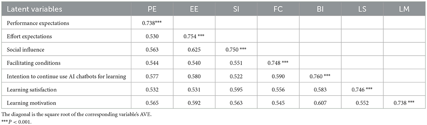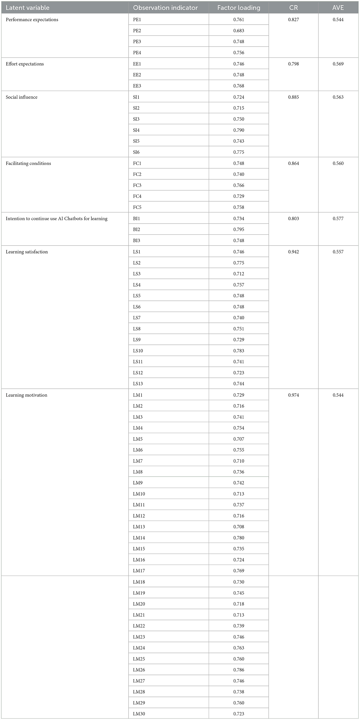 Table 4 presents the descriptive statistics for each item within the study's seven core variables, offering foundational insights into respondents' perceptions of AI chatbots in Chinese language learning. Across all variables, the mean scores of individual items range from approximately 3.51 to 3.66, indicating that learners generally express moderate to moderately high levels of agreement with statements related to the effectiveness, ease of use, social reinforcement, and motivational impact of chatbot-assisted learning. For instance, items such as PE1 (M = 3.61), EE1 (M = 3.58), and SI2 (M = 3.65) reflect relatively positive expectations regarding chatbot performance, usability, and social support.