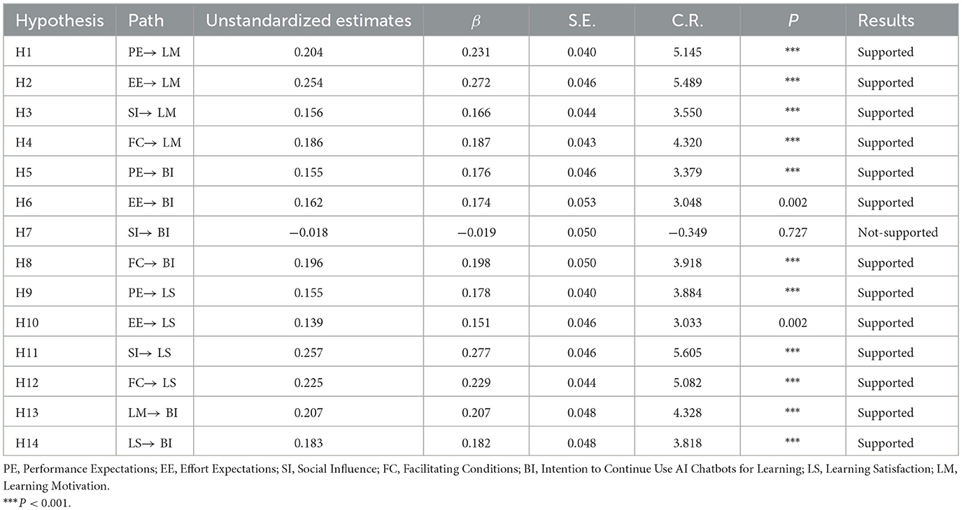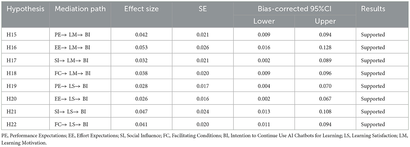 Learning satisfaction, which refers to learners' overall emotional and cognitive evaluation of their educational experience, has been widely regarded as a key antecedent variable affecting continued engagement with educational technologies in recent years (Bakir-Yalçin and Usluel, 2024; Liu et al., 2023). Performance expectancy, effort expectancy, social influence, and facilitating conditions are generally considered to be the main factors affecting satisfaction (Abbad, 2021). Specifically, when learners believe that a technology tool can effectively promote their academic outcomes and skill growth, performance expectancy will significantly enhance their satisfaction with the learning experience. In a language learning environment supported by AI chatbots, if learners perceive their own improvements in pronunciation, vocabulary mastery, and real-time interaction, their self-efficacy and sense of achievement will increase, thereby improving overall satisfaction (Abdelhalim and Alsehibany, 2025; Ding et al., 2025).