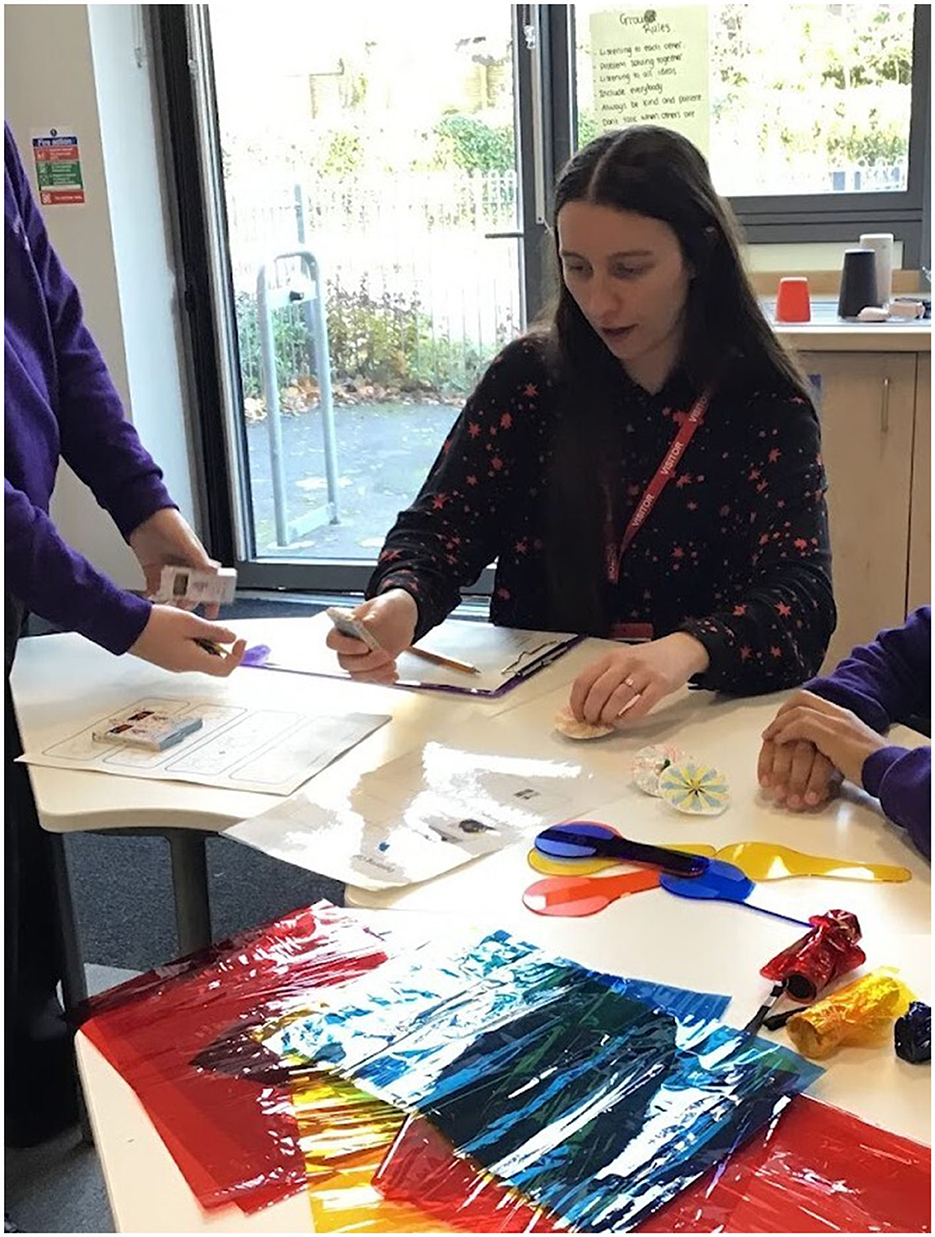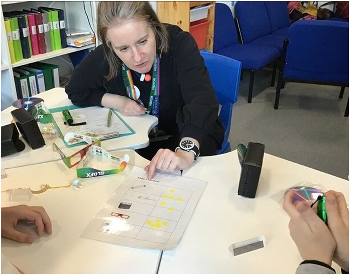 In the classroom sessions, the authors set up a carousel of hands-on exploratory activities linked to the topic of light and optics that could potentially feature in the backpacks. In groups of about 3 students each with a teacher or project team member, students were guided to explore each material and had the freedom to choose which one(s) they wanted to spend more time with, express which one(s) they enjoyed and any particular reasons. Meanwhile the adults observed and noted the engagement level, student quotes, and any ease or barriers and discomfort in physically handling objects. See Figures 1, 2 of authors Miranda and Vicky facilitating these activities. Students with the greatest needs e.g., non-verbal students were assigned to school staff with the expertise to engage them effectively.