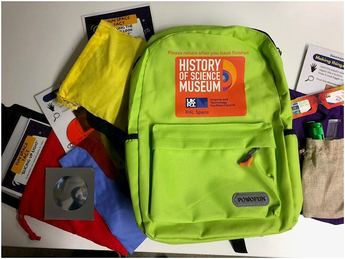 This work was possible through the successful application of two competitive public engagement grant awards, neither of which are specifically for SEND audiences. The project was initially funded through a 7-month Royal Society Public Engagement Fund awarded in 2021, as a “proof of concept” led by RAL Space in collaboration with HSM. Activity backpacks were made for children to borrow with their families at HSM in Oxford and understand key properties of light. This was achieved through hands-on exploration of the different ways that light can be modified and observed. Materials such as mirrors and filters were incorporated, which are fundamental optical components of telescopes and can be understood by children in their everyday uses. These materials were linked to examples in both modern-day space instruments that RAL Space has contributed to, and historical instruments at HSM. Establishing a collaboration between RAL Space and HSM leveraged expertise in developing museum activities, space science education and communication, and technical space instrumentation development. The project allowed the development, testing, and evaluation of the new outreach materials, however feedback from backpack users highlighted the need for more inclusive resources to engage young people with SEND.