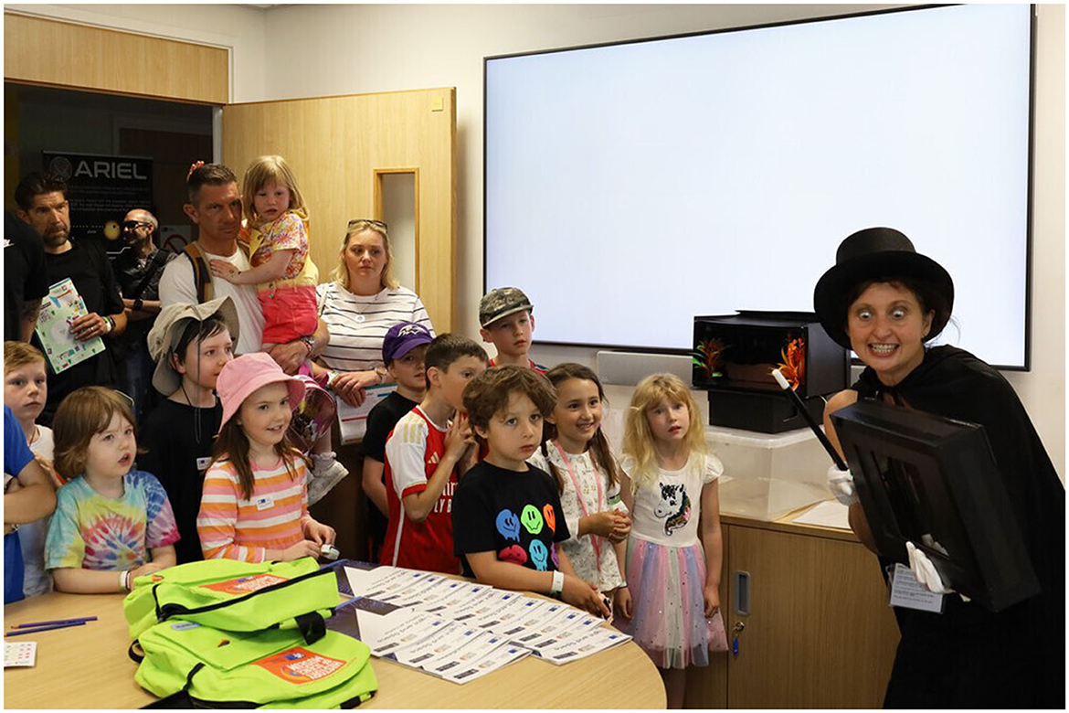 Figure 4. Helen Pooley performing the Science and Magic show at a public open day; role playing as a magician and revealing magic tricks that are explained by science. Photo consent was obtained from the audience members. Credit: STFC.