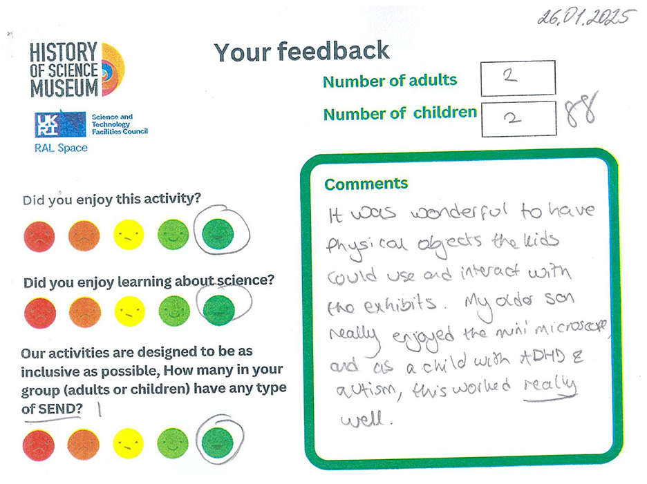 Pictorial postcards were used to assess the use of backpacks in the museum; they could be completed by one family member on behalf of the group, making it easier to share feedback, overcoming potential communication barriers for young people with SEND. An example is shown in Figure 5. Visitors were a mix of general public and the feedback postcard asked whether they enjoyed using the backpack and learning about science via circling varying levels of sad or happy faces. There was an open comment box, and people were asked to self-identify how many in their family/group had any type of SEND. In this evaluation, 97% of all families enjoyed using the backpacks in the museum, and 97% of the subset of families specifically with a SEND member enjoyed them. This equal proportion suggests that the backpacks are truly accessible to the intended audience. One parent commented: “It was wonderful to have physical objects the kids could use and interact with the exhibits. My older son really enjoyed the mini microscope, and as a child with ADHD & autism, this worked really well.”