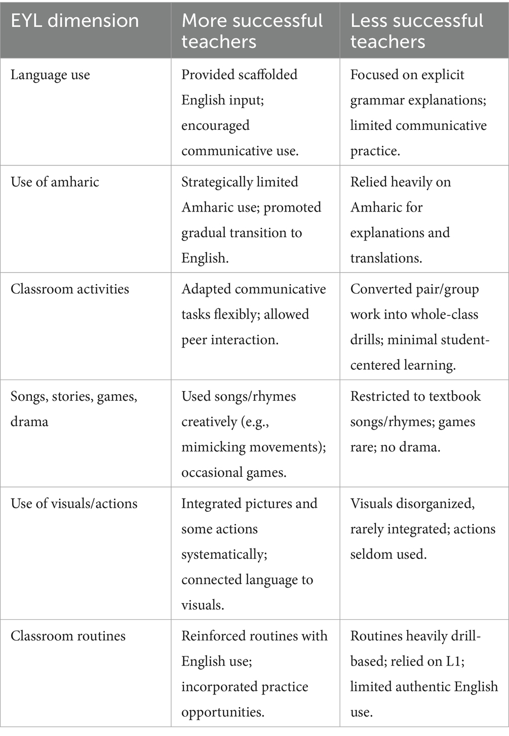 The teachers’ attempts to achieve enjoyment, achievability, and variety in classroom activities were sometimes successful and sometimes not. The crucial point here is that these attempts were not made systematically. For instance, the teachers were promoting the achievability of activities through excessive use of Amharic and by giving students too much time, which often led to disruptions from those who finished early. While the teachers varied classroom activities, they also strayed from the textbook’s guidelines. All of these indicate that the teachers lacked a thorough understanding of classroom activities and how to effectively implement them in young learner classrooms. Table 2 summaries the findings.