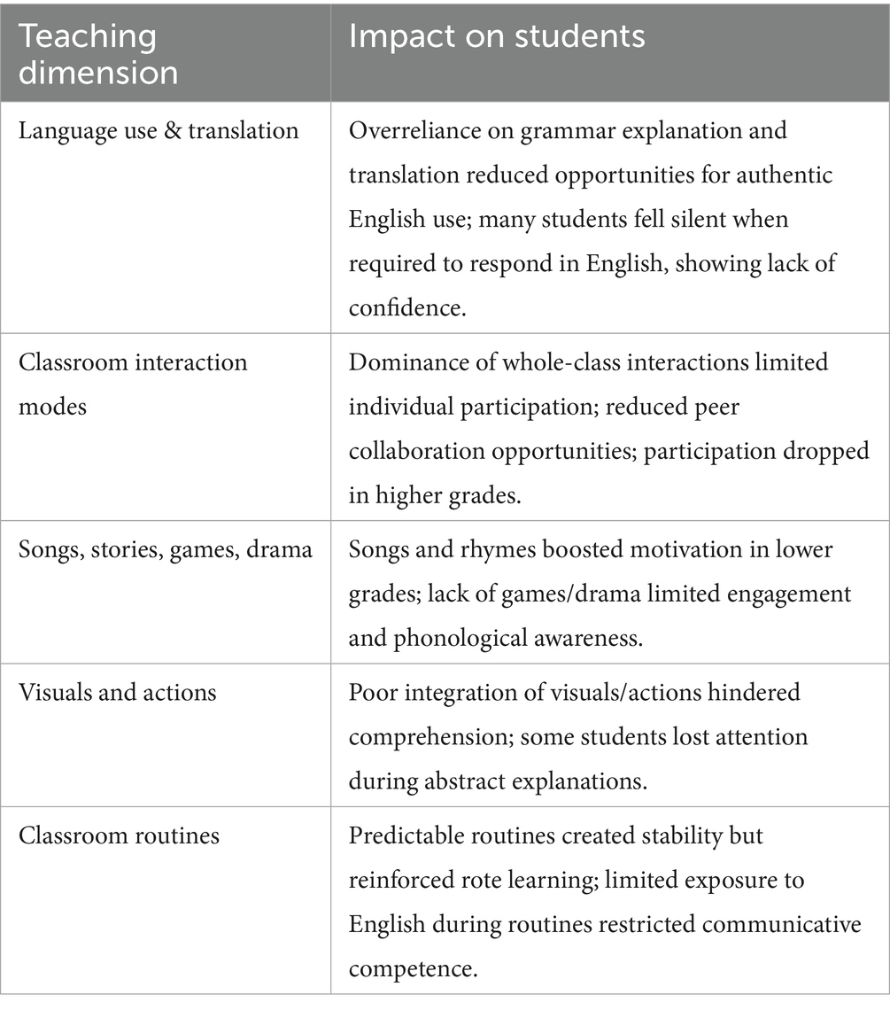 The teachers’ establishment of predictable classroom routines, such as structured greetings and lesson reviews, provided a sense of stability and familiarity for students. This aligns with research emphasizing the importance of routines in creating a supportive learning environment for young learners (Cameron, 2010). However, the over-reliance on drill-based activities and the limited use of English during these routines suggest a missed opportunity to reinforce language use in meaningful contexts.