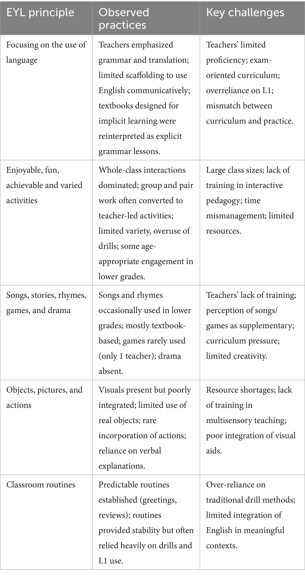 The challenges reported by teachers, including large class sizes, insufficient textbooks, and limited professional development, are consistent with findings from other studies of EFL teaching in sub-Saharan Africa (Brock-Utne, 2010). These challenges significantly impacted teachers’ ability to implement recommended EYL principles, leading to a reliance on traditional, teacher-centered methods. The lack of training in EYL-specific pedagogies further exacerbated these challenges, as teachers struggled to adapt their practices to the needs of young learners.