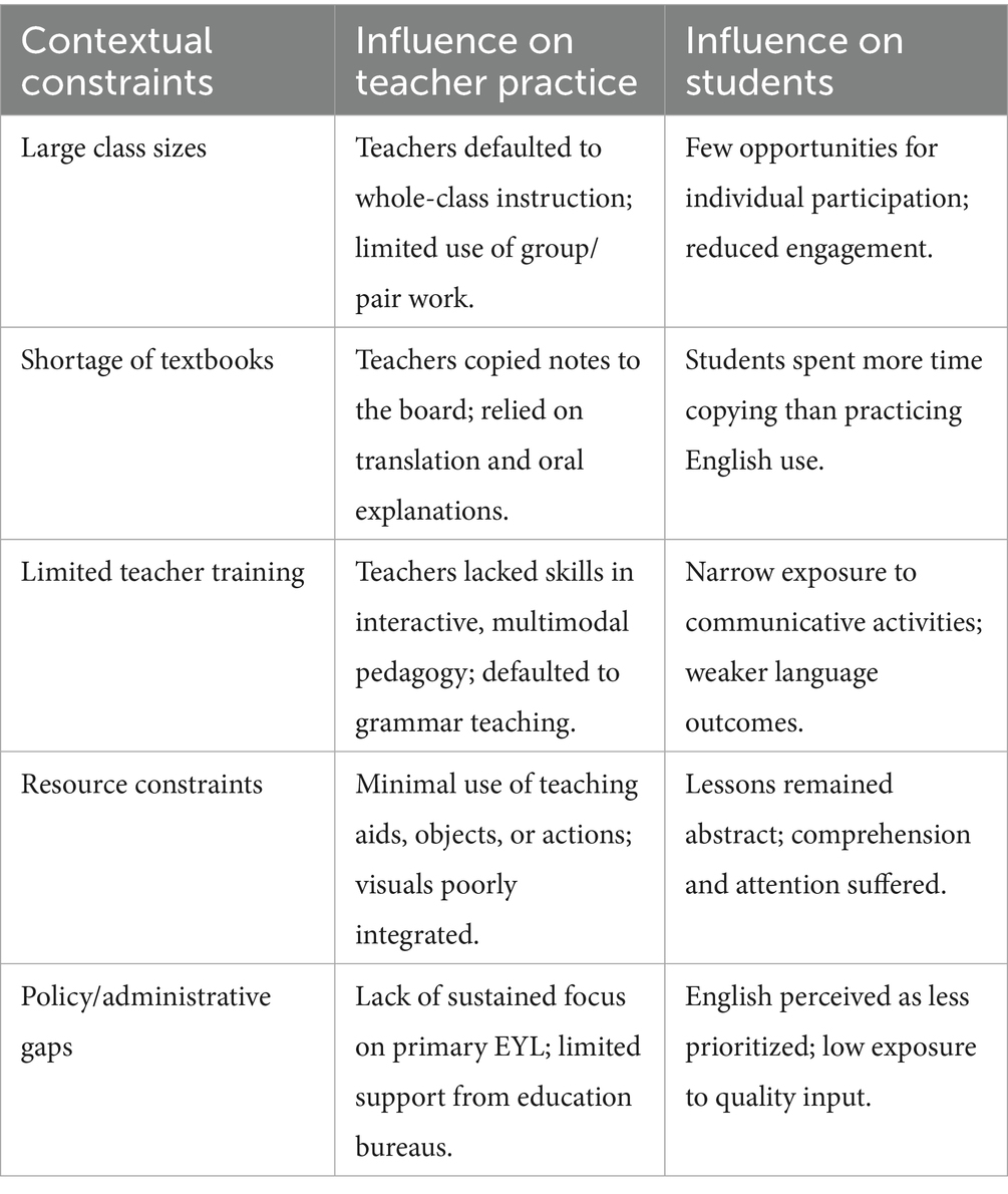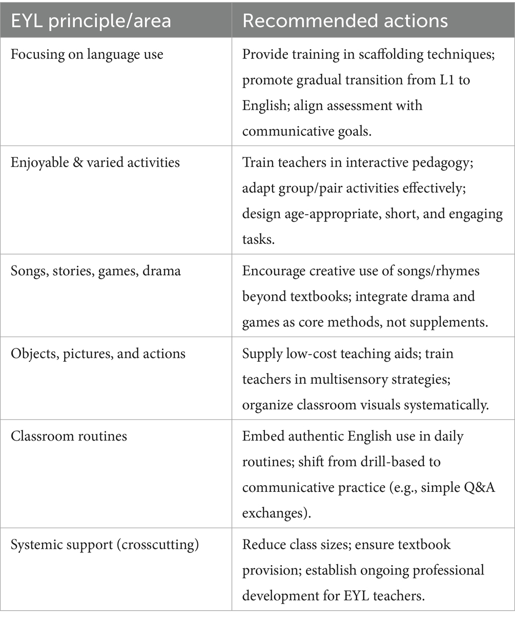 Overall, the discussion highlights a persistent gap between the principles of effective English teaching for young learners and the actual practices observed in Ethiopian classrooms. Teachers’ emphasis on grammar instruction and heavy reliance on translation reflect not only entrenched teacher-centered traditions but also systemic factors such as limited proficiency, exam-oriented curricula, and inadequate resources (Ellis, 2012; Richards and Rodgers, 2014; Paudel, 2020; Safeer et al., 2024). Although some teachers demonstrated partial success by scaffolding input and experimenting with communicative tasks, the overall picture remains one of misalignment with the principles of Communicative Language Teaching, which emphasize meaningful interaction and authentic language use (Littlewood, 2007b; Ashoori Tootkaboni, 2019). The limited use of songs, stories, games, and drama, as well as the superficial application of visual aids and actions, further constrained learners’ opportunities to engage with English in creative and multimodal ways (Brovchak et al., 2024; Narkabilova and Davidova, 2022). Contextual challenges, including large class sizes, shortage of textbooks, and lack of training, reinforced these limitations and shaped classroom practices in ways that reduced students’ motivation and communicative competence (Brock-Utne, 2010). Taken together, these findings suggest that improving EYL instruction in Ethiopia will require both pedagogical change at the classroom level and systemic reforms to ensure teachers are adequately supported in adopting practices that promote authentic language use.