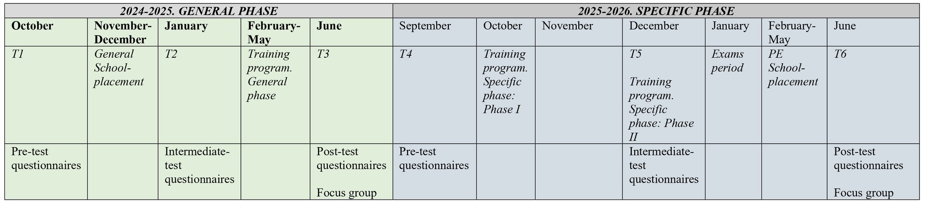 The training program is made up of two main phases: (1) A general phase which will be rolled out during the third year, and (2) A specific phase which will follow in the fourth year. Both phases comprise theoretical and practical sessions. Given that it is necessary for pre-service teachers to have studied and interiorized fundamental elements related to PE, the training program will begin in February, after 6 months of teaching (see Figure 1 for further information on the phases). The study was approved by the Research Ethics Committee of the [anonymized peer review process].