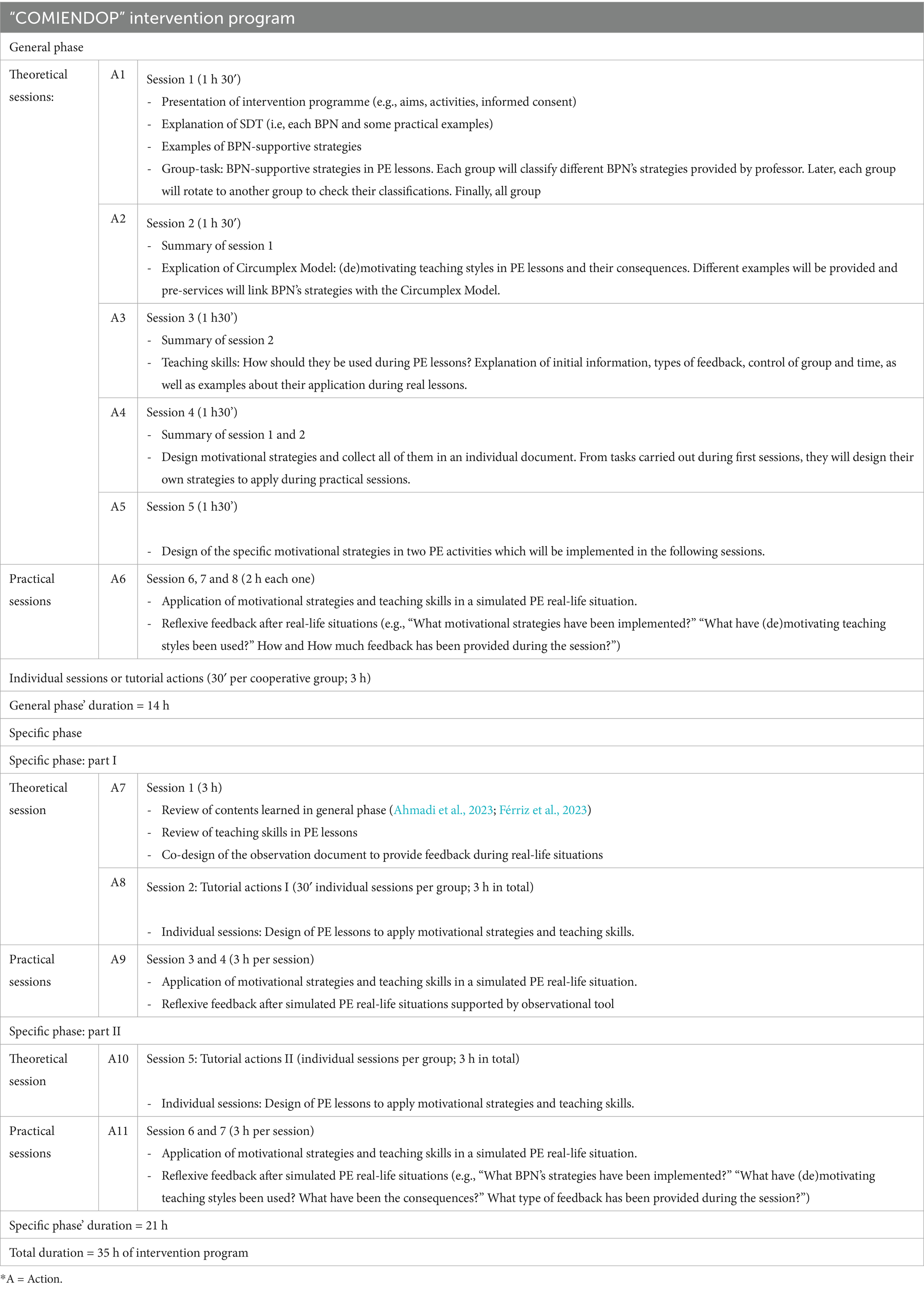 The intervention is structured into two main phases: (1) General phase, and (2) Specific phase (see Figure 1). This intervention will last a total of 35 h. At the end of the specific phase, pre-service primary PE teachers will be asked to deliver a lesson. Both theoretical and practical sessions will be conducted by university PE teachers who are experts on SDT and the Circumplex Model, as reflected by their more than 10 years of experience in implementing programs based on these frameworks. Participating teachers will also possess teaching experience at both the primary and university levels. The program will call on pre-service teachers to put into practice effective strategies grounded in SDT (Ahmadi et al., 2023) and Circumplex Model (Aelterman et al., 2019). For instance, they will implement autonomy-, competence- and relatedness-supportive strategies through motivating teaching styles (i.e., autonomy supportive and structure styles). Moreover, each session will start with a brief review or summary of the previous session to reinforce student learning.