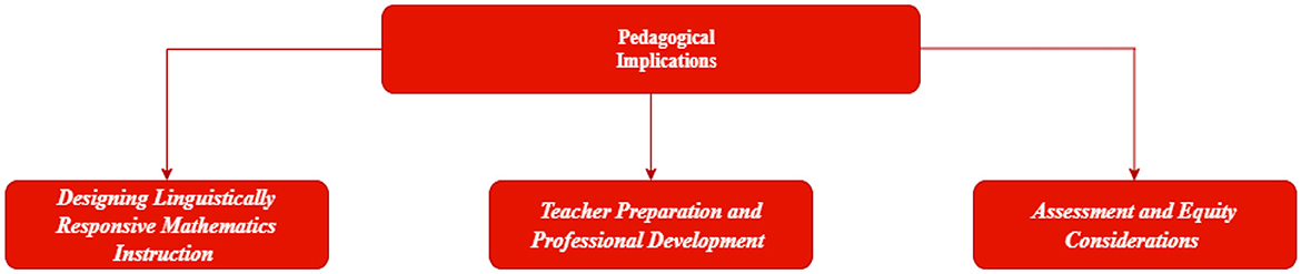 Assessments in mathematics often overlook the linguistic demands they place on students, leading to inaccurate judgments about their mathematical ability. Language bias in standardized assessments disproportionately affects ELLs and students from linguistically diverse backgrounds, who may understand the mathematical content but struggle to interpret complex word problems or instructions due to language difficulties (Buono and Jang, 2021). Such assessments may conflate language proficiency with content knowledge, contributing to underperformance and misplacement in intervention programs. To promote equity, assessments must be designed with linguistic accessibility in mind. This includes simplifying language without reducing mathematical rigor, offering alternative formats (e.g., oral responses, visual prompts), and allowing the use of students' first language where possible. Educators and policymakers should also advocate for culturally and linguistically inclusive testing practices that reflect the diversity of learners. Equitable assessment is not just a fairness issue; it is essential for recognizing and nurturing the full range of students' mathematical competencies (Alam and Mohanty, 2023). Figure 2 represents pedagogical implications for linguistics and mathematics.