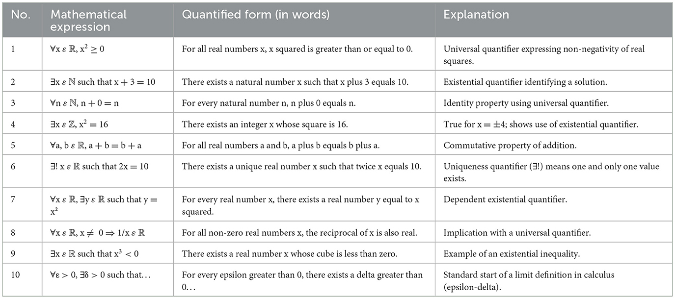 Table 1 illustrates how mathematical syntax, through the precise use of quantifiers and symbolic expressions, mediates the communication and interpretation of mathematical meaning. Each expression reflects how language structures such as universal (∀), existential (∃), and uniqueness (∃!) quantifiers are used to formalize general truths, identify specific instances, or assert uniqueness within mathematical logic. For example, statements like “∀x ε R, x2 ≥ 0” and “∃x ε Z, x2 = 16” translate complex ideas into concise symbolic language that captures universal validity and existence, respectively. These quantified forms demonstrate how formal mathematical language enhances clarity, precision, and abstraction, allowing concepts like identity, commutativity, implication, and limits to be universally understood and communicated. In this way, the syntax of mathematics operates not merely as a tool for calculation but as a linguistic system that shapes and conveys deep mathematical meaning.