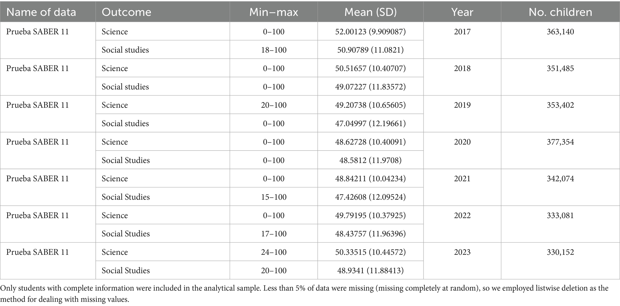 Data for this study were provided by the Instituto Colombiano para la Evaluación de la Educación (ICFES), a government agency responsible for assessing student performance across different subjects. The data collected corresponded to the SABER 11 test, a nationwide exam administered to students in their last year of high school, for the period 2017–2023. Although all high school students must take the SABER 11 test, only students with complete information were included in the analytical sample. Because less than 5% of data were missing completely at random, we employed listwise deletion as the method for dealing with missing values. As such, we have an analytical sample that is smaller than the population of high school students that took the exam for each of the cohorts. We selected this period of study because 2017 was the first year where students were assessed on topics associated with peace, development studies and conflict resolution as part of the social studies test. Similarly, we selected 2023 as the last cohort because that was the last year for which information was fully available. Hence, the inclusion of data from 2017 to 2023 allows for a comprehensive cross-cohort analysis, enabling us to observe trends and the persistence of socioeconomic achievement gaps over time, including the period affected by the COVID-19 pandemic. While the stability of mean scores across these years might appear surprising given the pandemic’s impact on education, this study explores the factors associated with achievement gaps in science and social studies within each cohort. Table 1 summarizes the basic characteristics of the datasets used for this study, including scores for school outcomes and sample sizes.