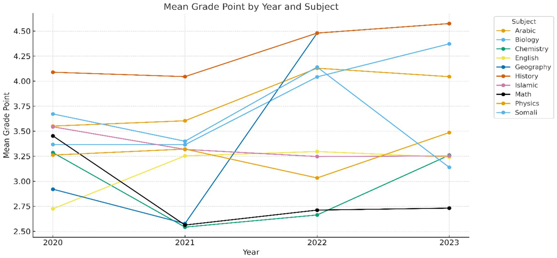 This section presents the analysis of academic performance in Somaliland’s national examinations. The analysis begins with descriptive statistics, followed by performance visualizations by subject, year, and region. The final part focuses on multilevel model comparisons and interpretation.
