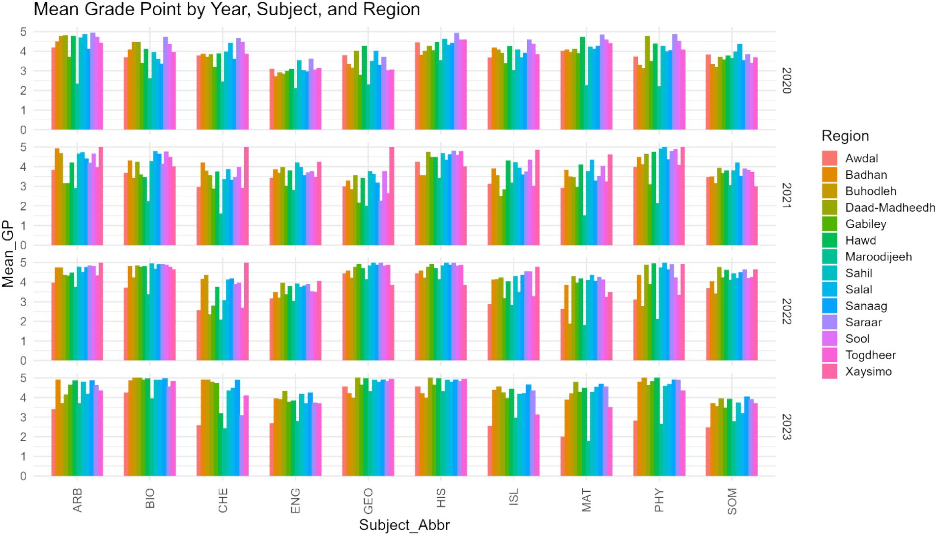 To explore differences across regions, average grade points were categorized by region, subject, and year. Figure 2 illustrates notable variations in performance across Somaliland’s regions. Regions such as Maroodijeeh and Sahil consistently achieved higher average grade points, whereas Sool, Togdheer, and Xaysimo recorded lower averages. The most significant regional disparities were observed in technical subjects like Mathematics and Chemistry, highlighting persistent geographic inequalities in educational outcomes. These visual patterns emphasize the importance of employing multilevel modeling to account for the influence of school and regional factors.