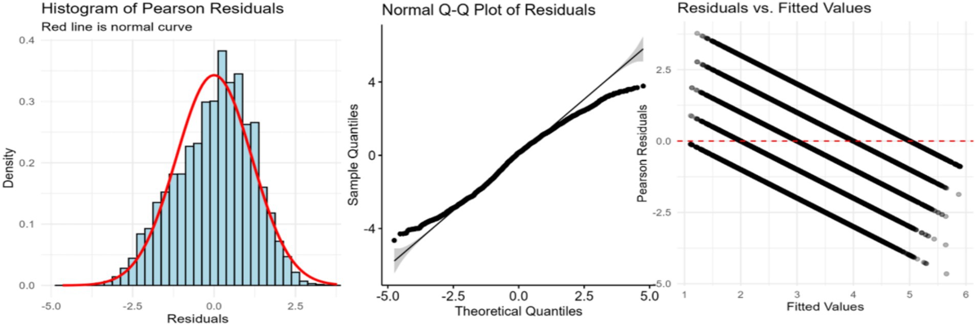 To verify the assumptions of the final Random Slope model, an extensive diagnostic analysis of the residuals was performed. The Normal Q–Q plot of the Pearson residuals showed that they were roughly normally distributed, with only slight deviations at the extreme ends, which is typical in large datasets. A histogram of the residuals also supported this near-normal distribution. To evaluate homoscedasticity, we plotted the Pearson residuals against the fitted values. This scatterplot displayed no noticeable pattern or funnel shape, indicating constant variance across the range of predicted values. Together, these diagnostic checks confirm that the final model is robust and its assumptions have been reasonably satisfied. For complete transparency, the diagnostic plots are presented in Figure 3.
