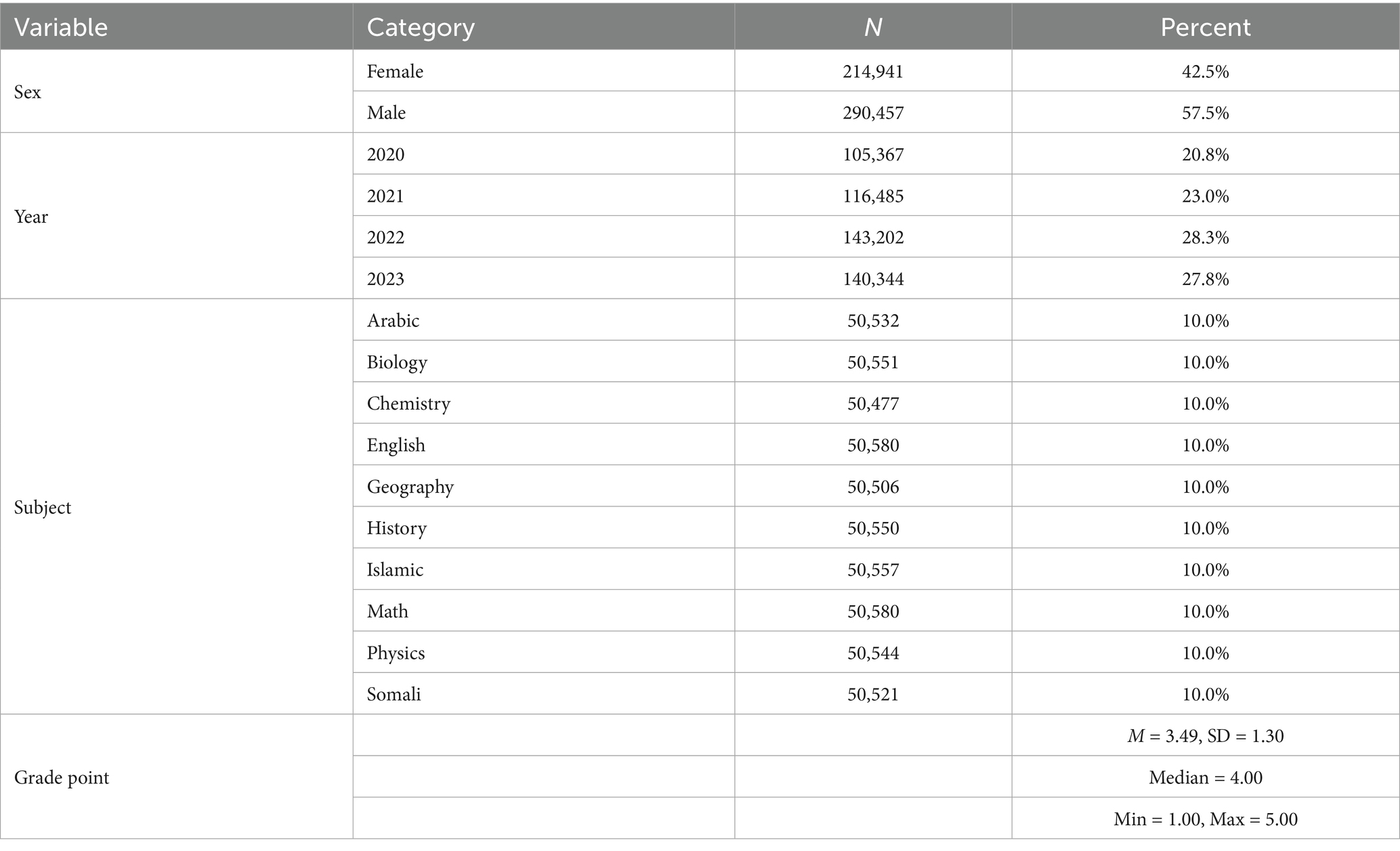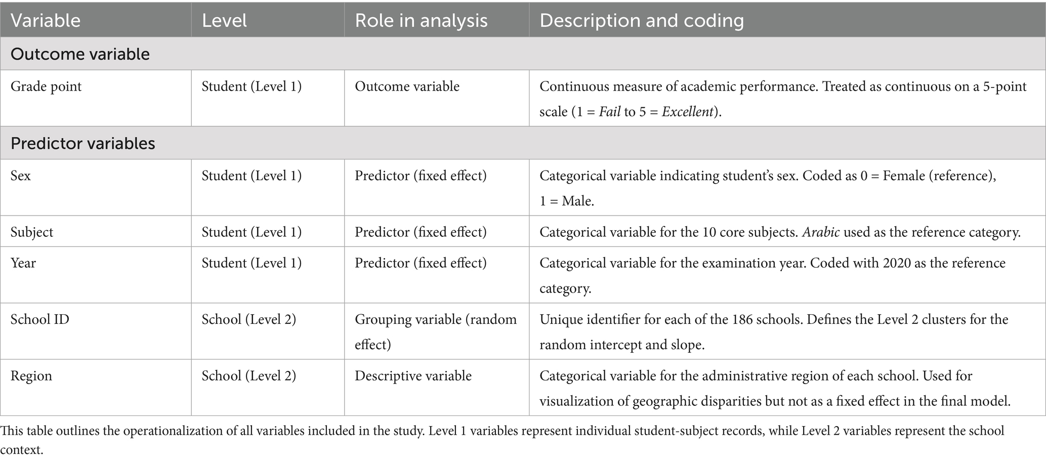 The analysis is based on an anonymized administrative dataset supplied by the Somaliland National Examination and Certification Board (SLNECB). This dataset includes all individual grade records for students who took the national secondary school leaving exams from 2020 to 2023. Initially, the raw data comprised 505,399 subject-level entries. After excluding one entry with a missing grade point, the final dataset for analysis contained 505,398 entries from 186 different secondary schools spread across Somaliland’s administrative regions. The data’s hierarchical structure, with individual subject grades (Level 1) grouped within students, who are further grouped within schools (Level 2), makes it particularly suitable for multilevel analysis.