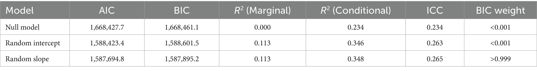 To address the hierarchical nature of the data, a multilevel modeling strategy was employed. The initial null model, which included only an intercept, revealed that 23.4% of the variance in grade points could be attributed to school-level differences (Intraclass Correlation Coefficient [ICC] = 0.234). Following this, two further models were developed: the Random Intercept Model (RI), which incorporated fixed effects for Sex, Year, and Subject, and the Random Slope Model (RS), which allowed the influence of Sex to differ among schools. Model fit was evaluated using the Akaike Information Criterion (AIC), Bayesian Information Criterion (BIC), and both marginal and conditional R2. As detailed in Table 3, the Random Slope Model demonstrated the best fit, evidenced by the lowest AIC and BIC values and the highest BIC weight.