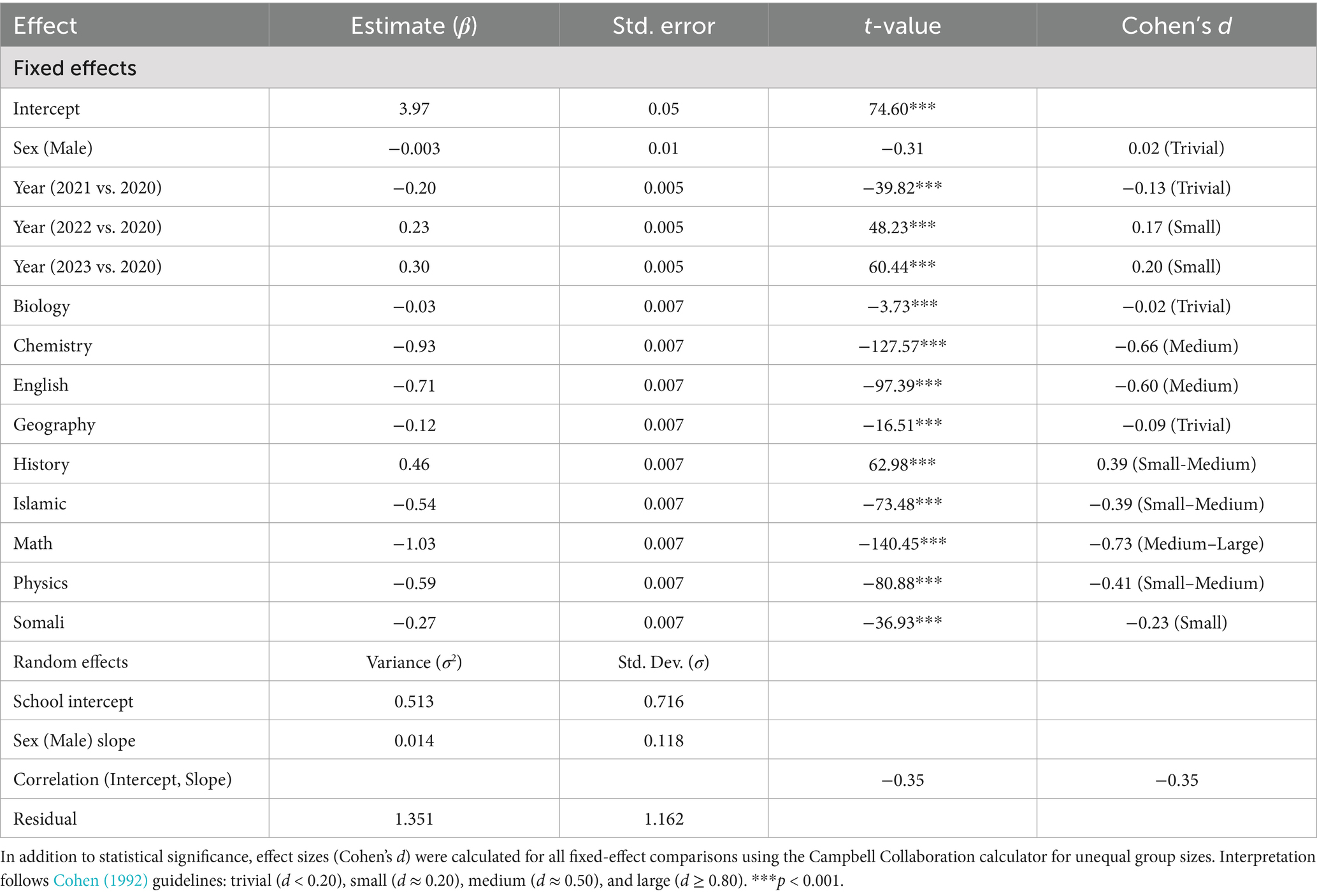By contrast, subject-level disparities were more substantial. Mathematics (d = −0.73) and Chemistry (d = −0.66) showed medium-to-large disadvantages relative to Arabic, highlighting systemic weaknesses in STEM education. English (d = −0.60) and Physics (d = −0.41) reflected medium disadvantages, while Islamic Studies (d = −0.39) and History (d = +0.39) indicated small-to-moderate differences. Somali (d = −0.23) showed a small disadvantage, whereas Biology (d = −0.02) and Geography (d = −0.09) revealed trivial effects.