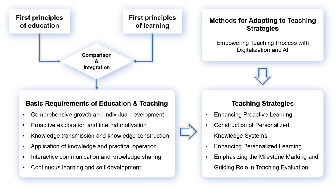 First principles of education and learning, which emphasize the interconnectedness of six dimensions such as holistic development and personalized growth, serve as the fundamental starting point for instructional design and innovation in teaching methods. They also act as criteria for evaluating teaching effectiveness. Teaching strategies based on first principles need to emphasize the following four aspects: