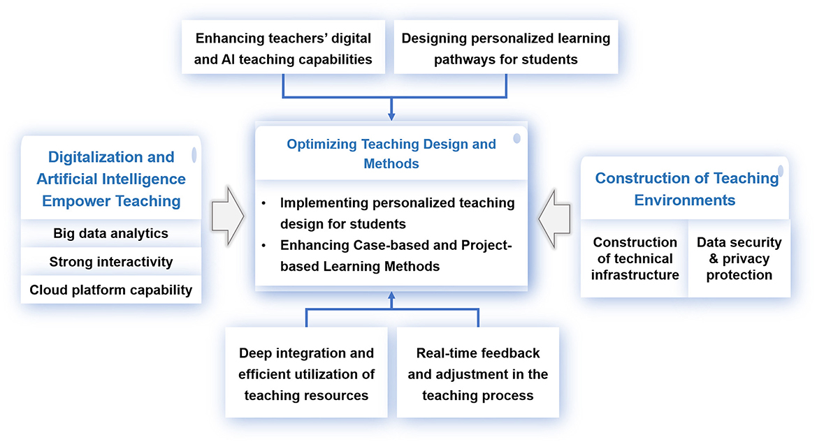 Teachers are the key agents in the implementation of teaching design. They need to master new technological tools and teaching concepts. Systematic training should be provided to enhance teachers‘ familiarity with digital technologies, their ability to use AI tools, their capacity to train teaching assistant agents, their teaching design skills, and their adaptability to new teaching models. This will encourage teachers to take the initiative in digital and intelligent teaching reforms. They can use smart teaching platforms and AI tools to design personalized learning paths and leverage big data and AI to analyze students' learning situations.