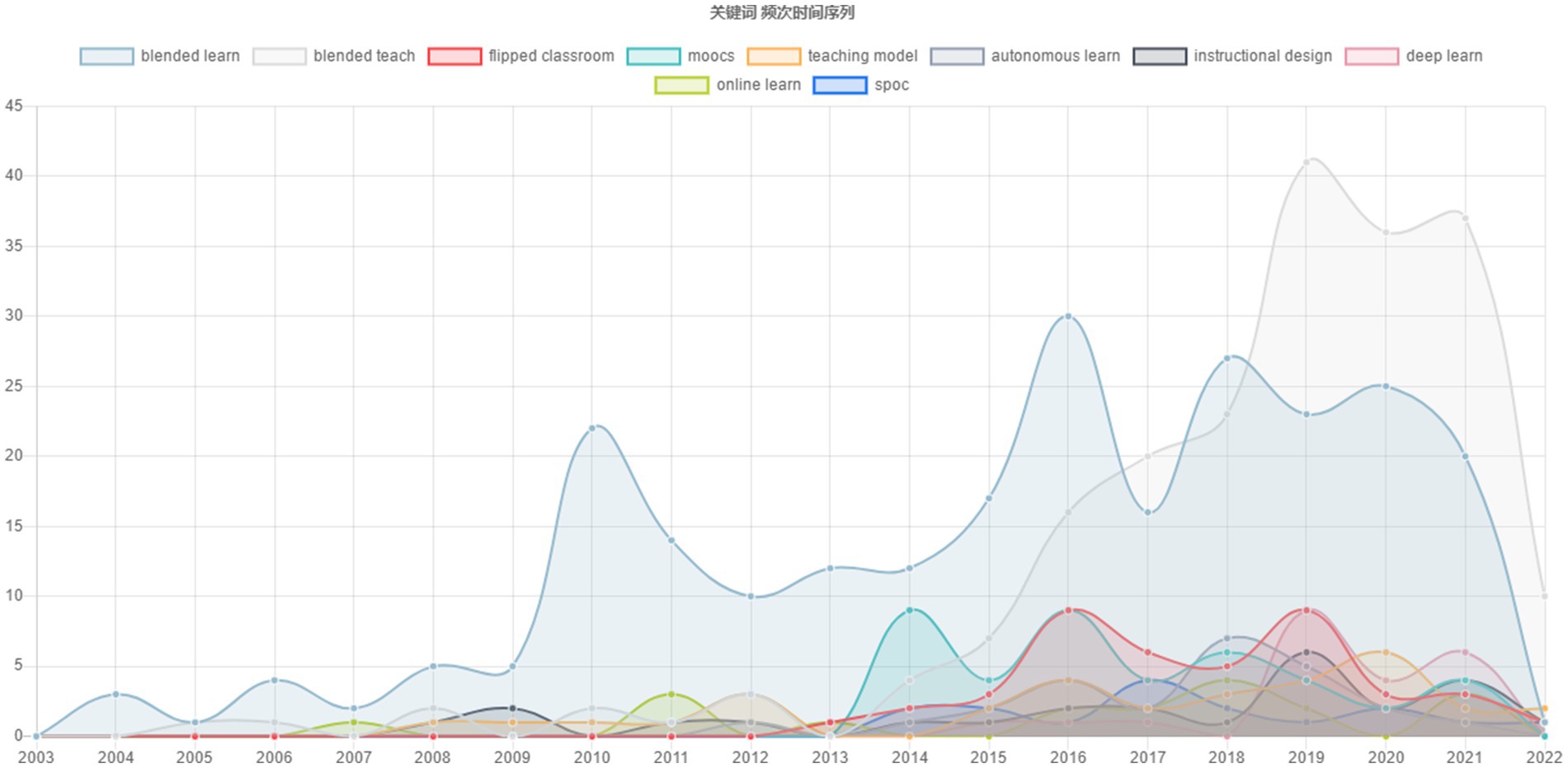 After Professor Kekang He introduced blended learning and constructivism to China for the first time, many Chinese educational technology scholars and experts began to study this research field (He, 2004). Blended learning has now become a popular topic for domestic teaching reform. In July 2022, a total of 5,136 articles with the theme of blended learning were retrieved from CNKI (China National Knowledge Internet). Among them, 569 articles are from core publications of Peking University or CSSCI (Chinese Social Sciences Citation Index).