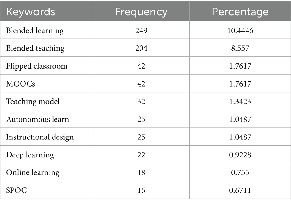 Table 1. Blended learning’s top 10 keywords with the largest number of topics retrieved from core publications of Peking University or CSSCI in CNKI.